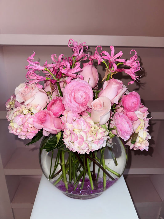 This arrangement, housed in a unique silver vase, is a stunning blend of pink hydrangea, red and hot pink roses, white tulips, white phalo orchids, burgundy stock, and green bells of Ireland. It's a celebration of diverse expressions, perfect for those moments when you want to show deep affection in a grand way.