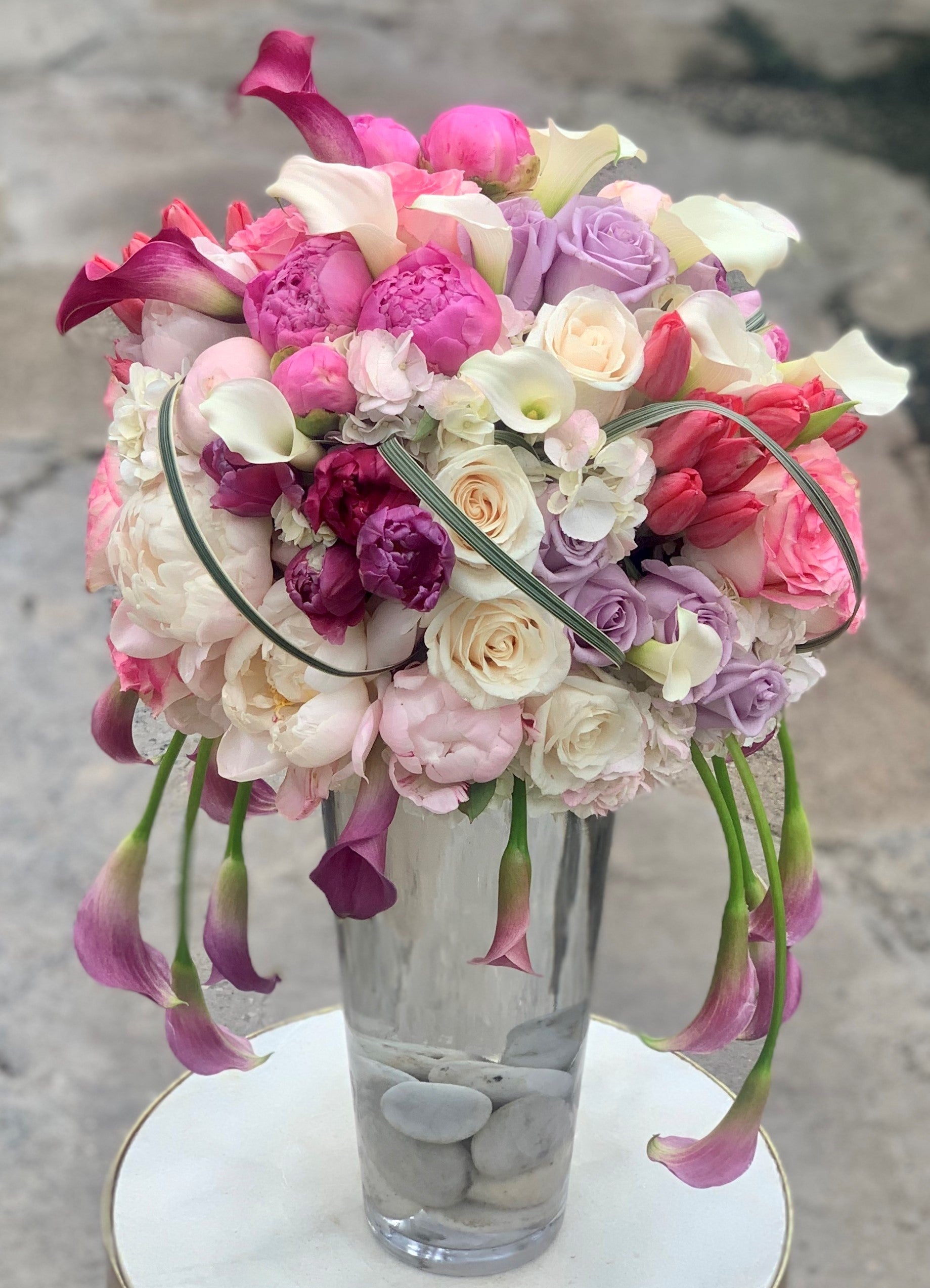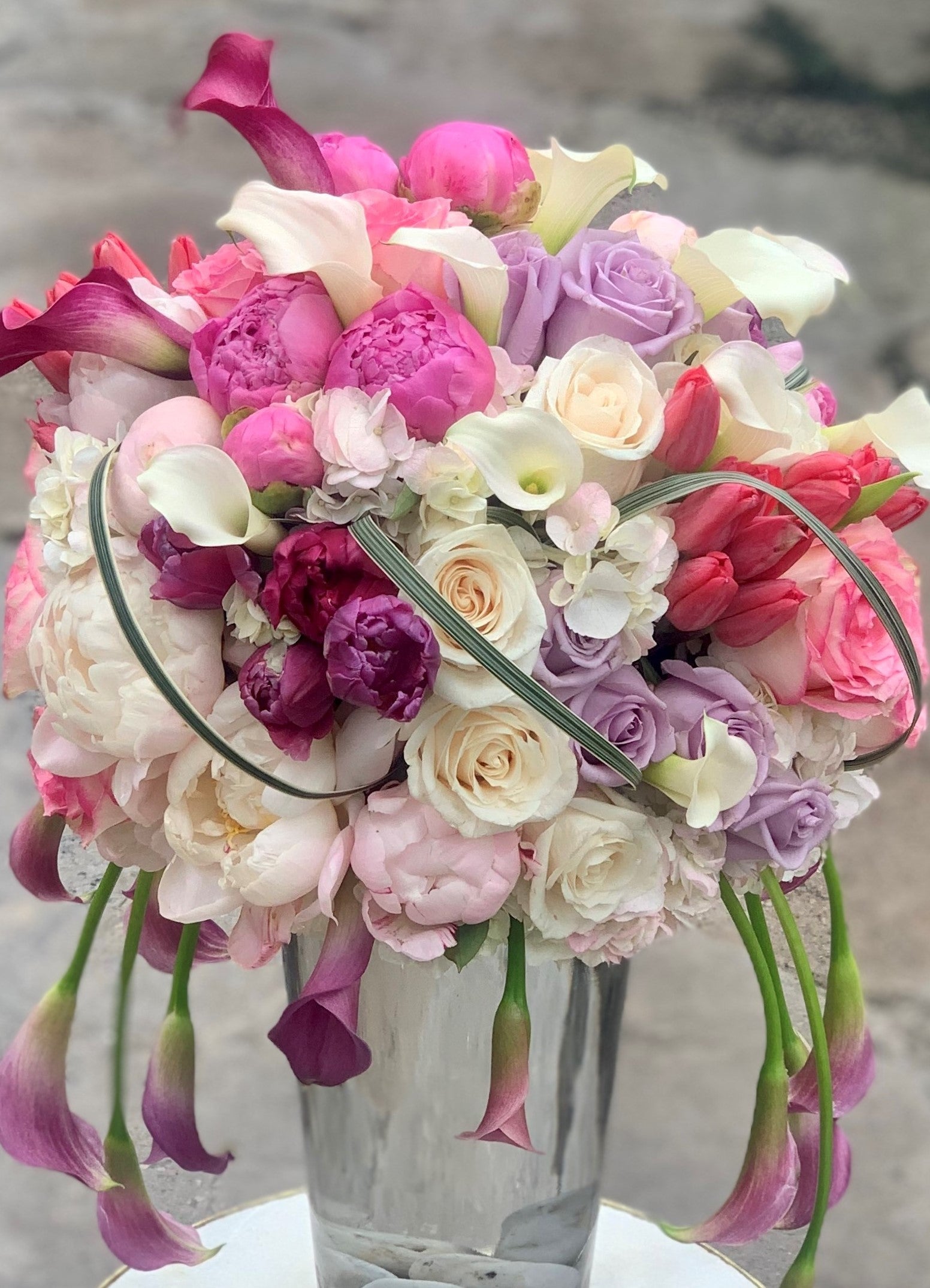 A beautiful collection of peonies, callas, tulips, and roses.