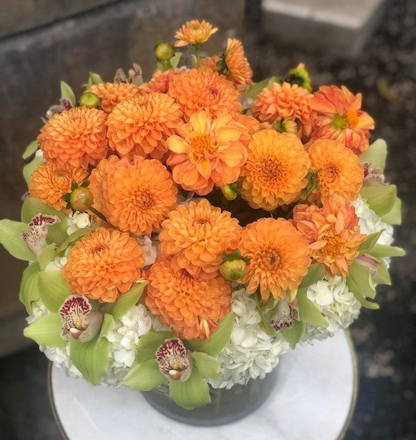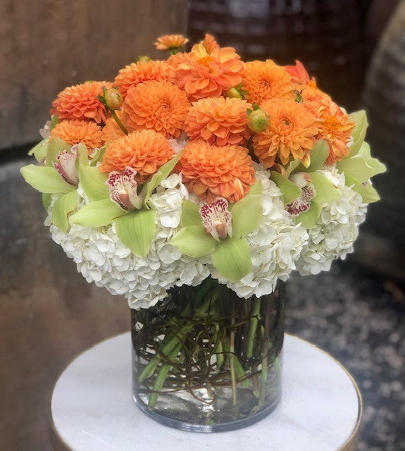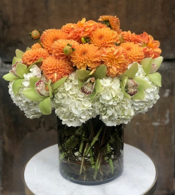 In a medium height cylinder vase with white hydrangea, green cymbidium orchids and orange dahlias. Same day delivery.