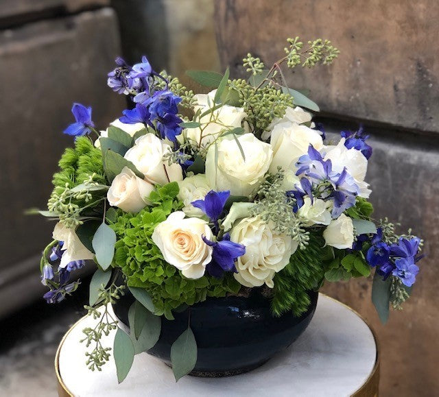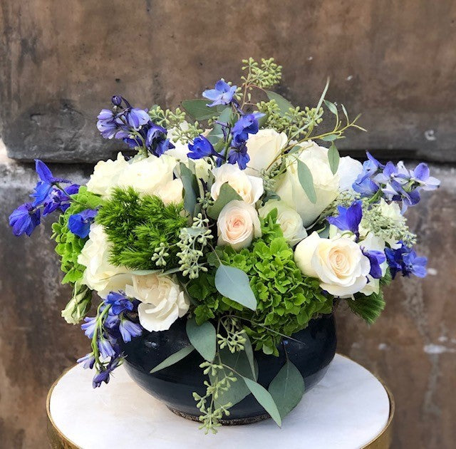 In a low blue ceramic pot with a mix of green hydrangea, white roses, blue delphinium, green trick and seeded eucalyptus. same day delivery.