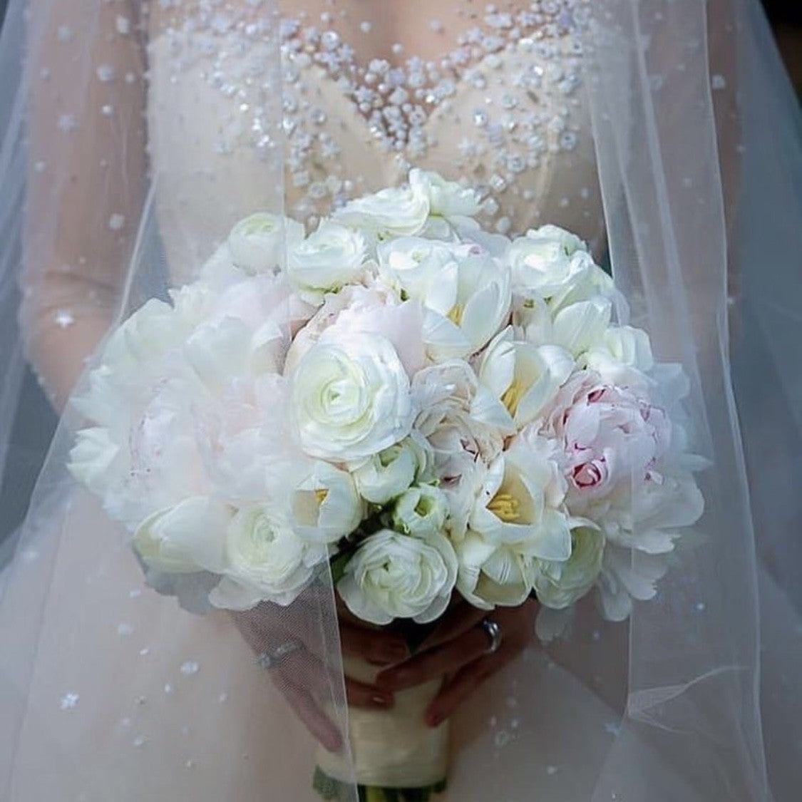 Mixture of Premium Florals, White Ranunculus, White Tulips and a touch of Light Pink Peonies.
