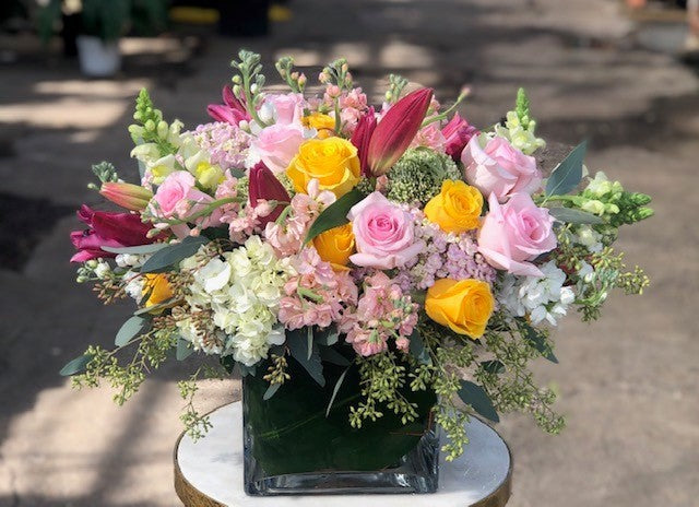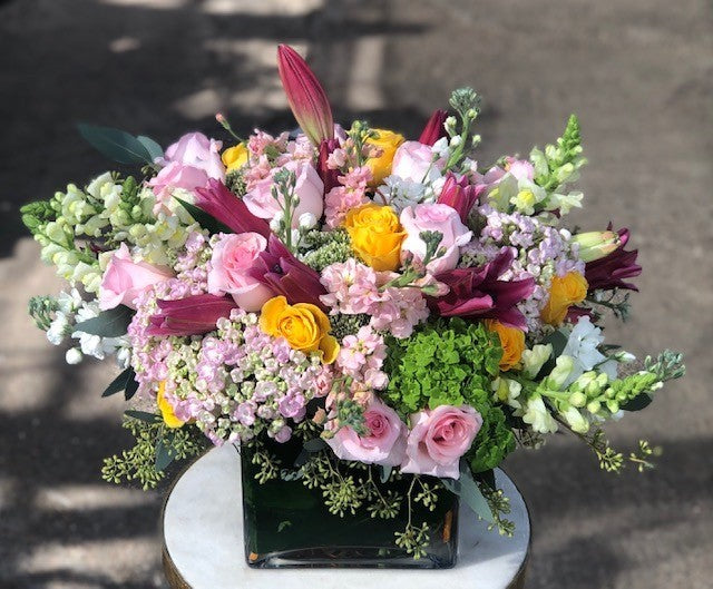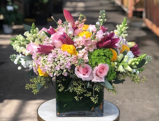 In a large cube a mix of green and popcorn hydrangea, yellow & pink roses, burgundy lilies, pink stock, yellow snapdragons and seeded eucalyptus.