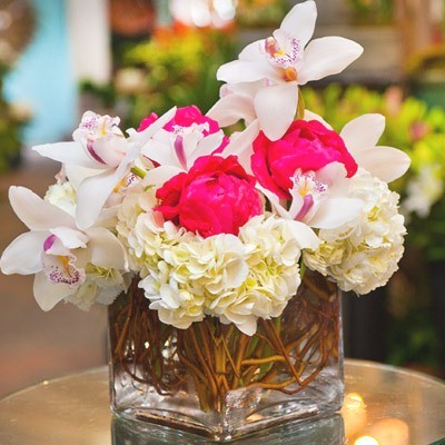 Beautiful Peonies and gorgeous Cymbidium orchids in a glass cube with Curly Willow. A designer made beautiful arrangement perfect for just about any occasion.