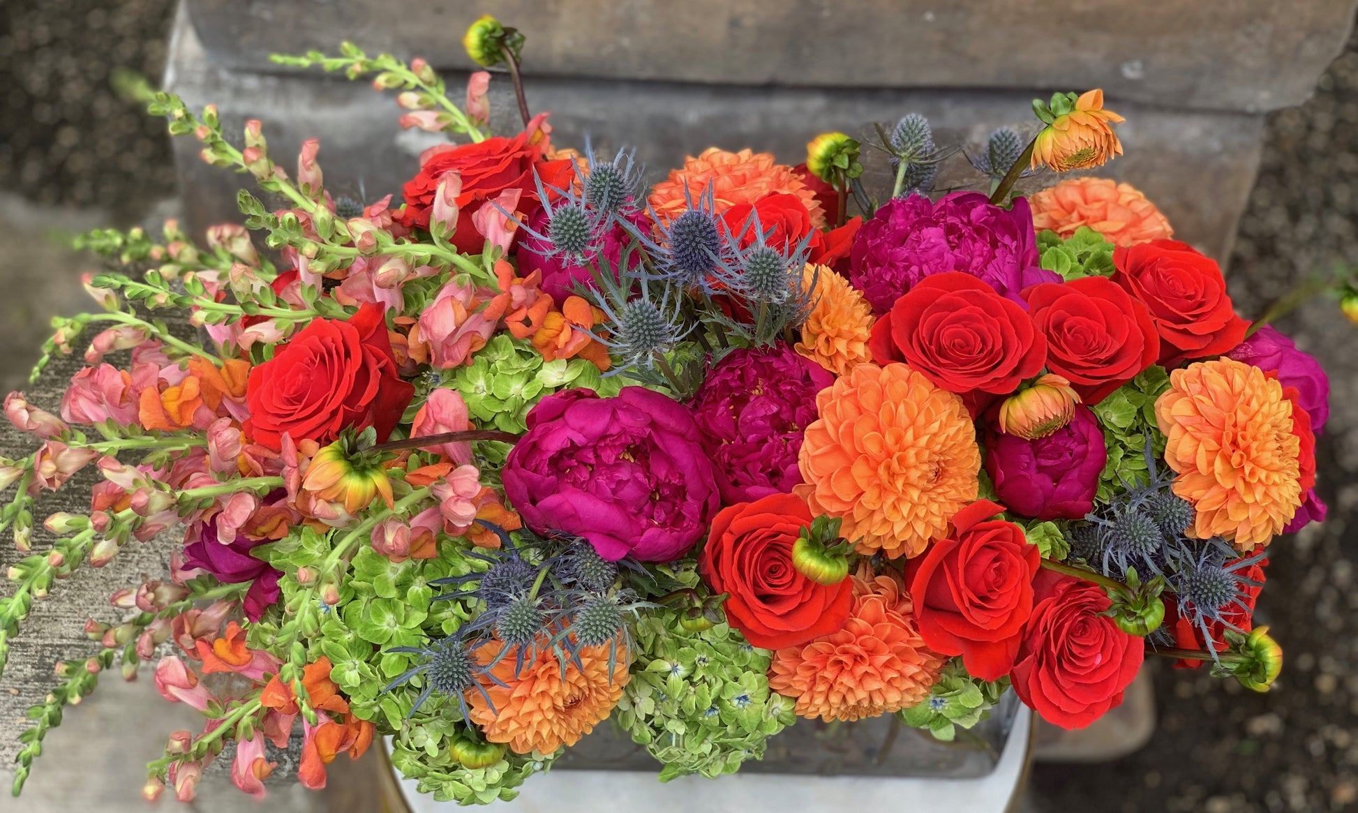 A beautifully designed mixed of green hydrangea, red roses, purple peonies, orange dahlias, pink snapdragon and blue thistle in a rectangular vase. Bright arrangement for same day delivery *Seasonal flowers- ask for availability* *Same day delivery*