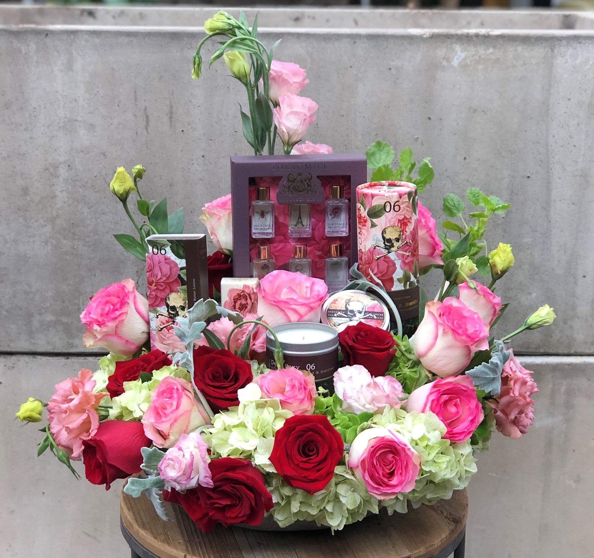 In a low grey ceramic vase a mix of white & green hydrangea, red & pink roses, pink lisianthus, dusty miller and a collection of our best seller Tokyomilk Products including: Tokyomilk Dead Sexy Perfume Tokyomilk Mini Perfume Set Tokyomilk Hand Lotion Tokyomilk Lip Balm