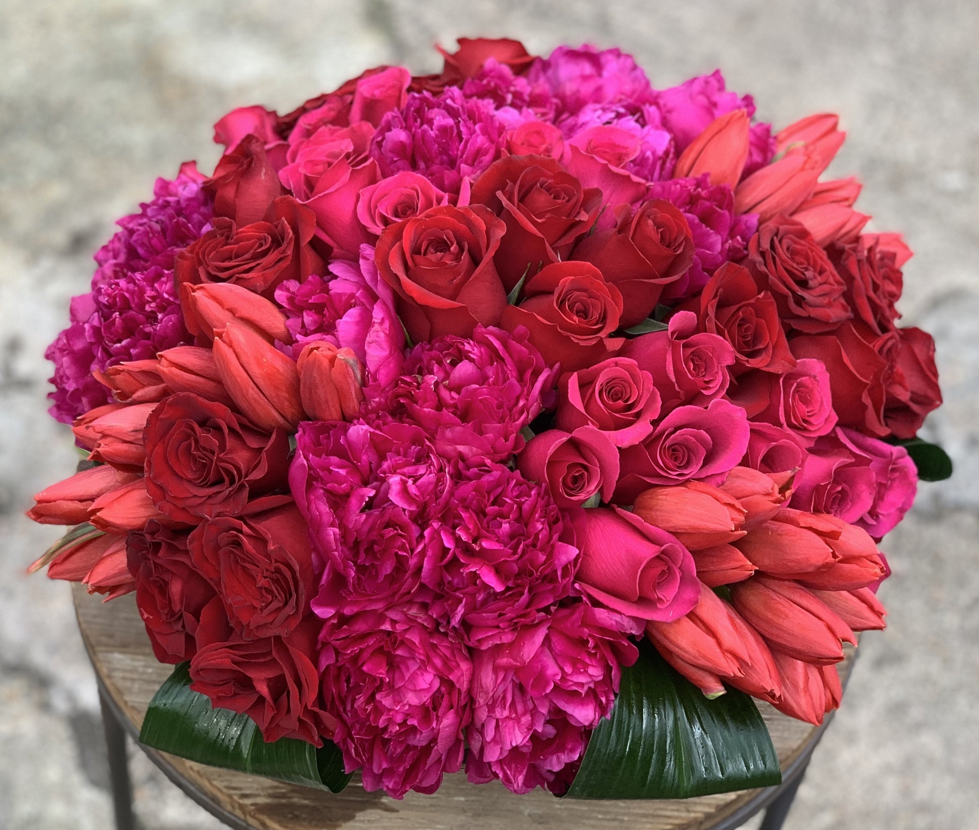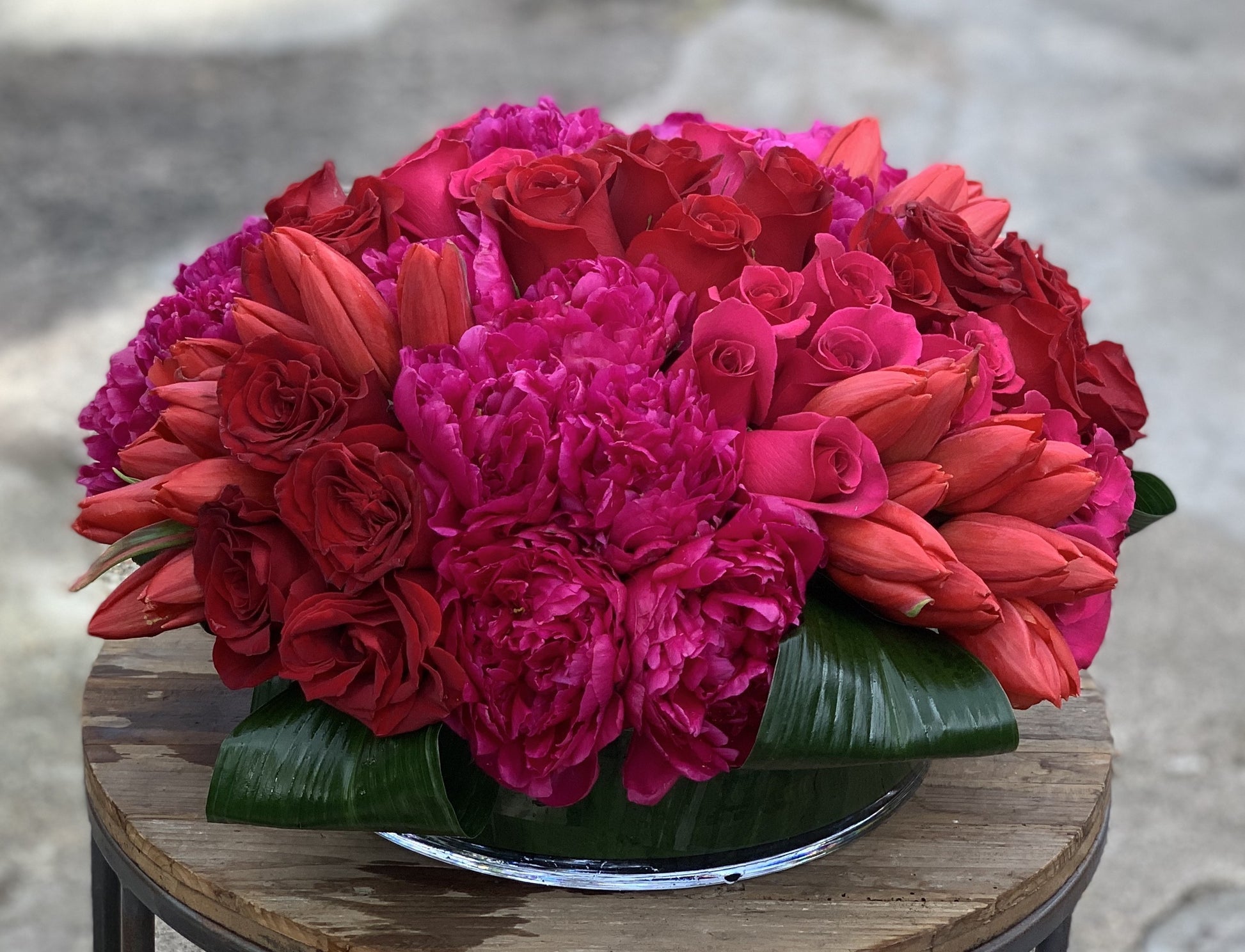 In a low leaf lined glass cylinder vase a mix of red tulips, red roses and purple peonies.