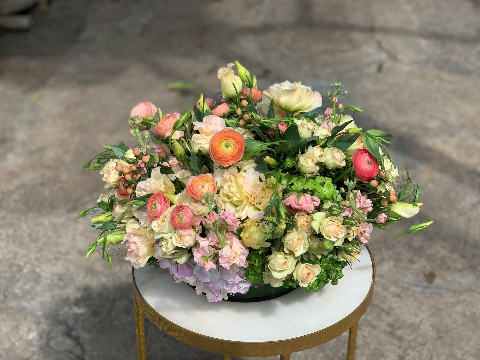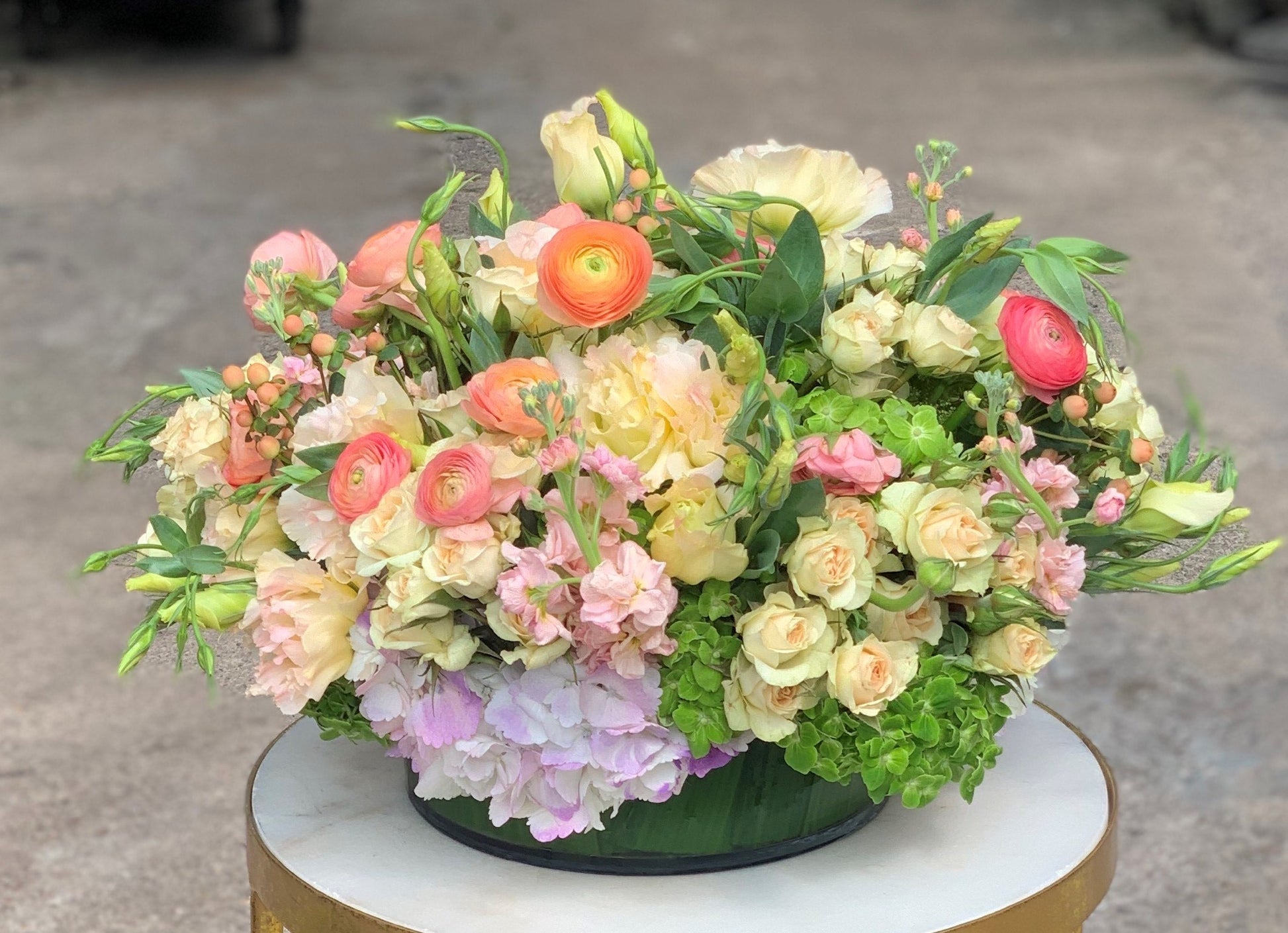 In a low cylinder vase a mix of light purple & green hydrangea, peach lisianthus, light pink stock, creme spray roses, peach ranunculus and peach berries.