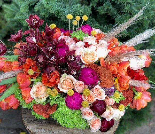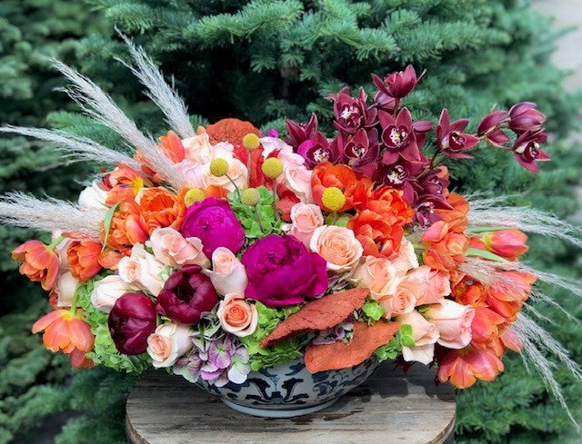 In a low china bowl a mix of green hydrangea, purple and burgundy peonies, orange tulips, yellow billy balls, dark purple orchids, peach roses and pampass grass.