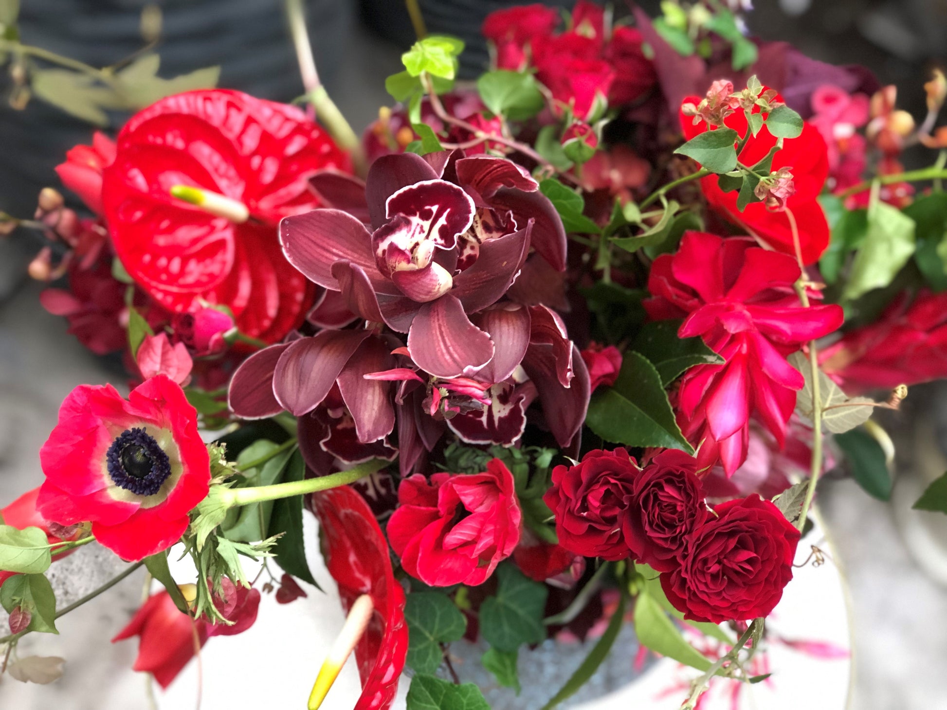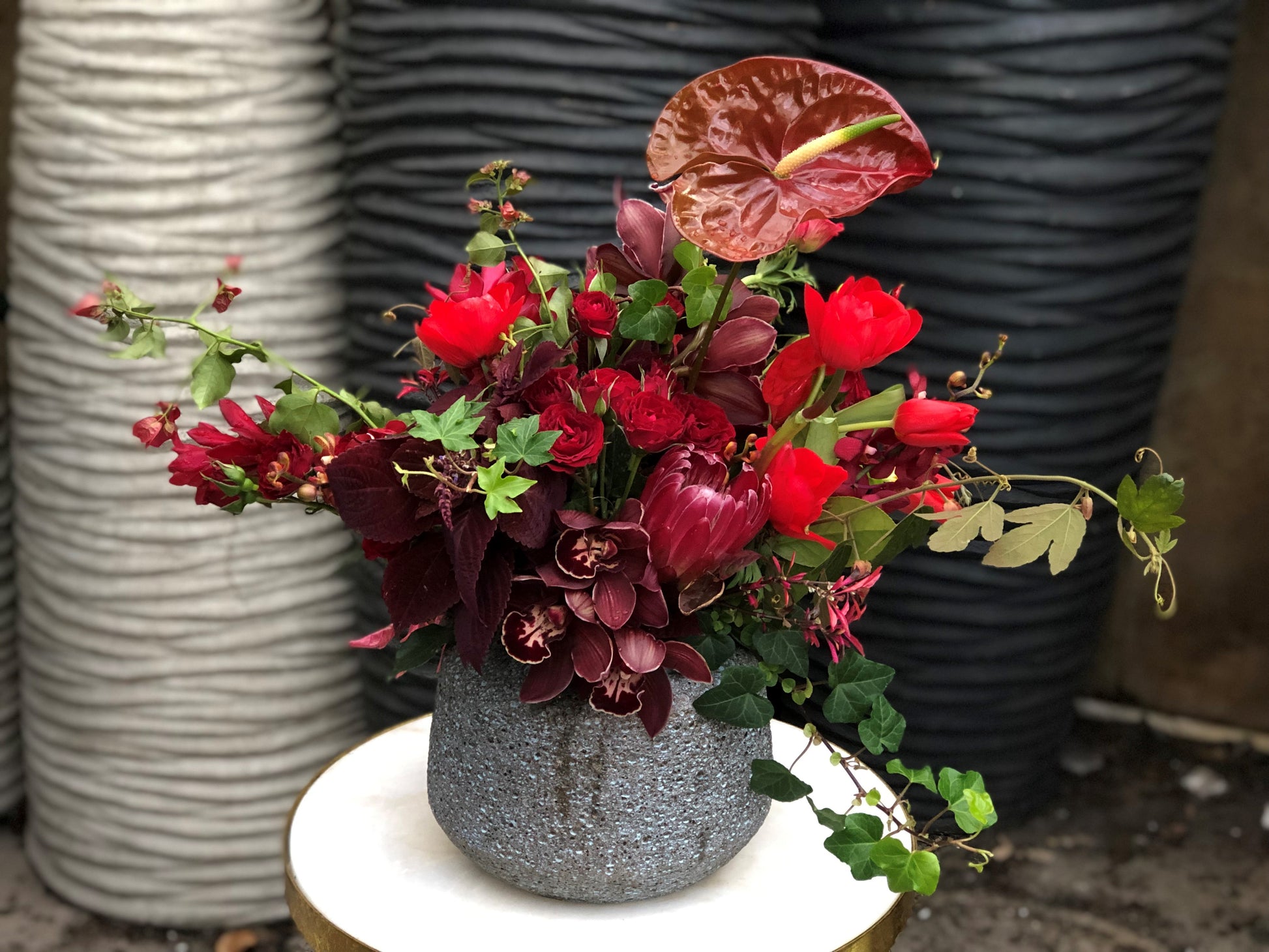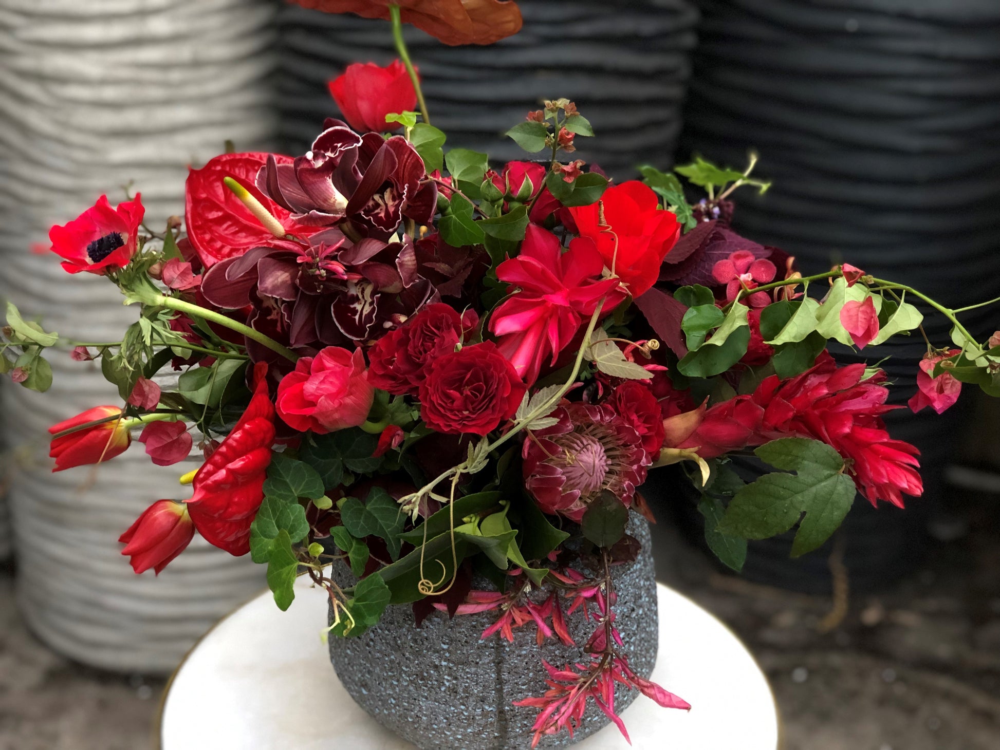 Medium Grey Ceramic, beautiful garden mix of cymbidium, protea, roses, tulips, anthirium and ivy greenery