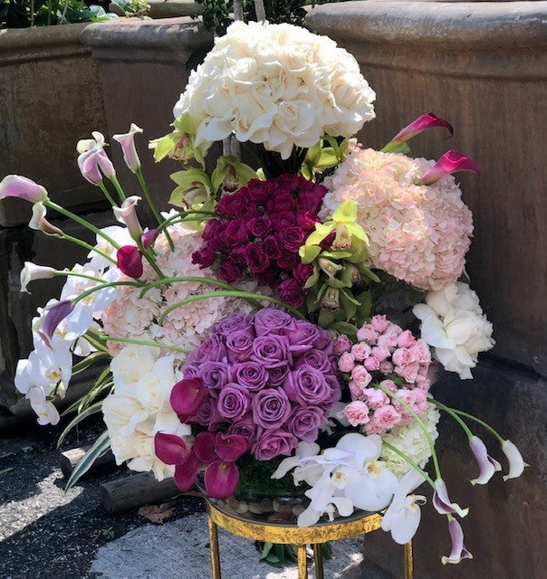 In a 10" lomi dish with river rocks clusters of lavender roses, ivory roses, pink spray roses, white and pink hydrangea, purple spray roses, purple calla lilies, green cymbidium orchids, white phalo orchids and greenery. *Call to order* * same day delivery* special order