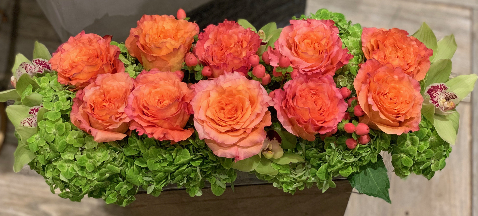 Long and Low stunning arrangement with gorgeous free spirit roses, berries and bold green hydrangea, this make a beautiful centerpiece, desk arrangement. Ready for delivery today