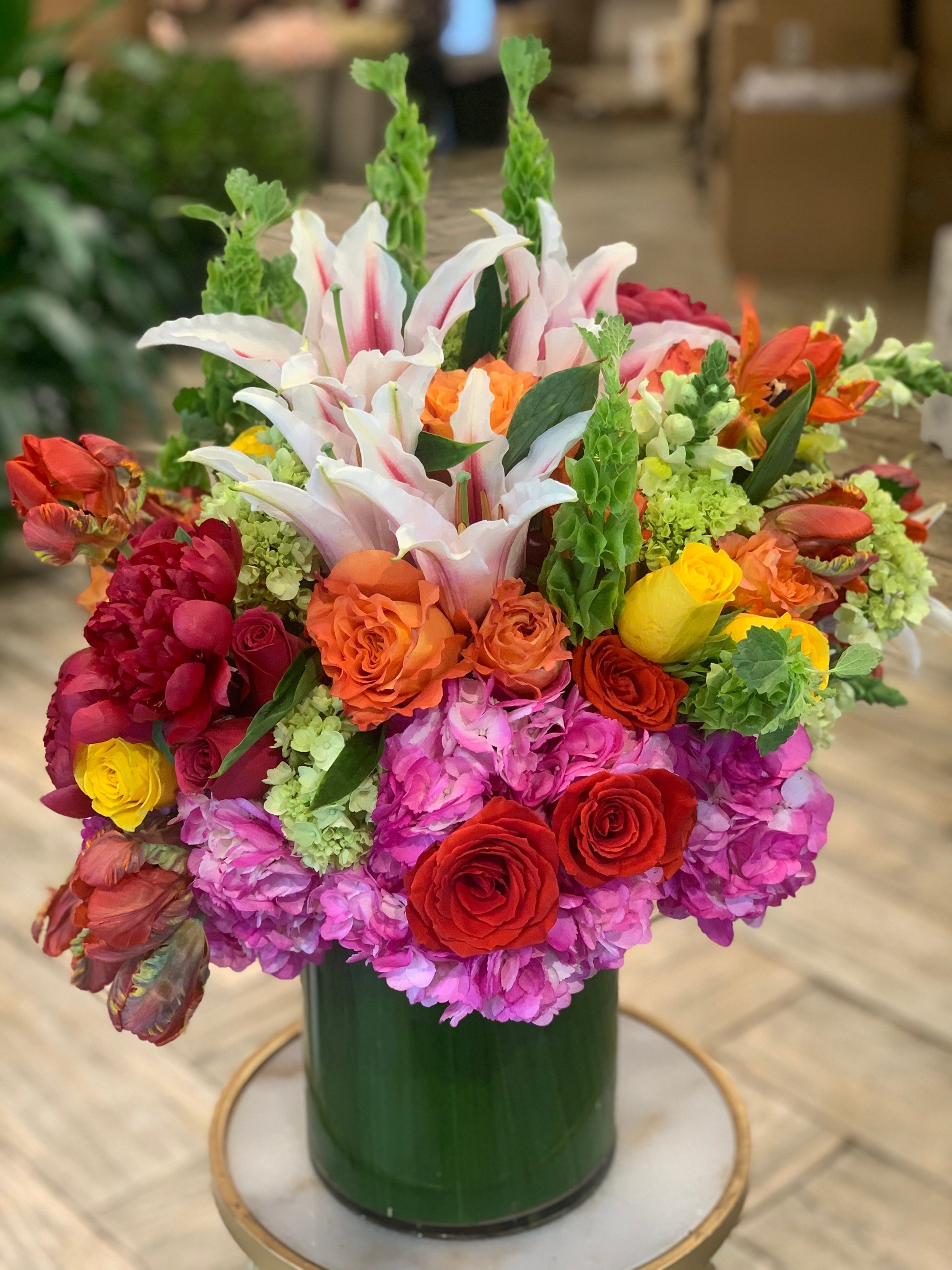Hot Pink Hydrangea, Red and Orange French Tulips, Red, Orange, and Yellow Roses, Fuchsia Peonies, Stargazer Lilies, Bells of Ireland, and Yellow Snapdragons arranged in a leaf lined cylinder vase. H:24" W:8"