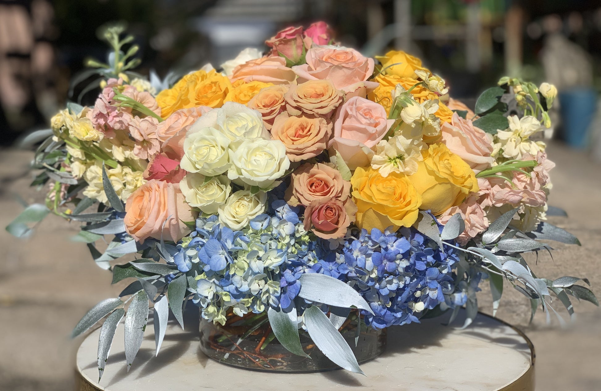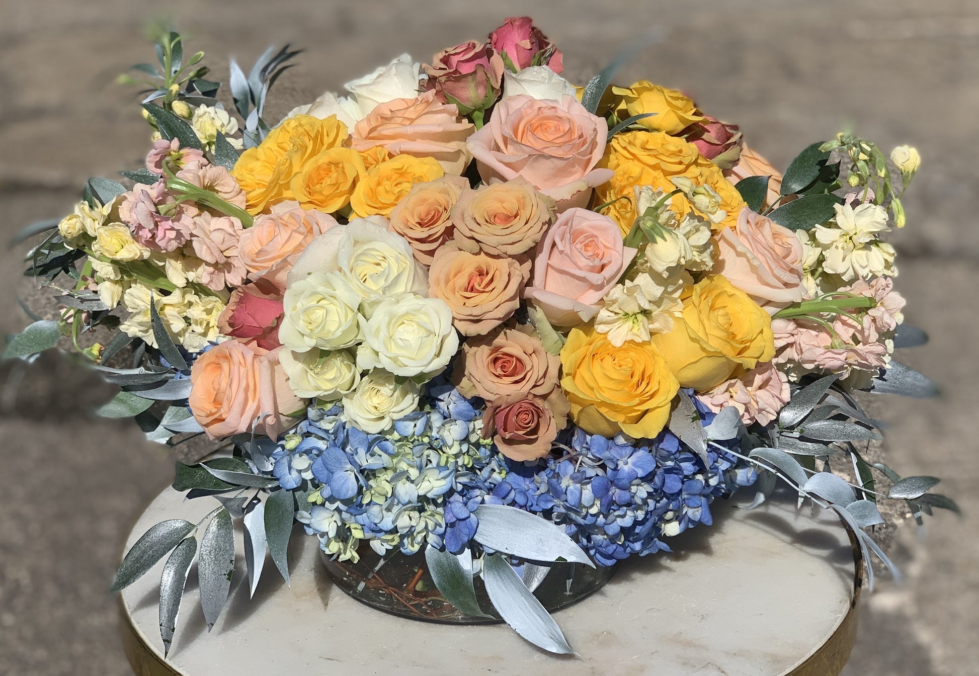 In a low cylinder glass vase a mix of blue hydrangea, yellow, white and peach roses, peach and yellow stock and mixed greenery.