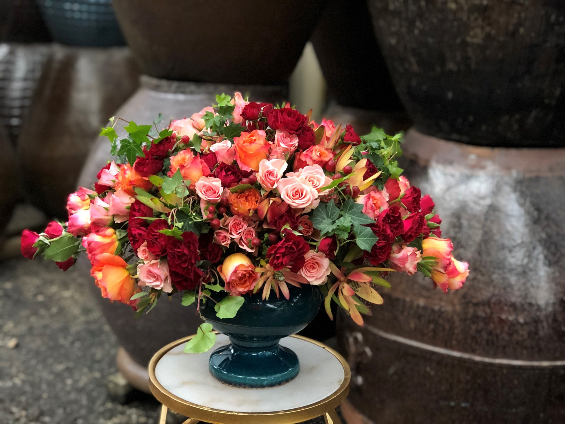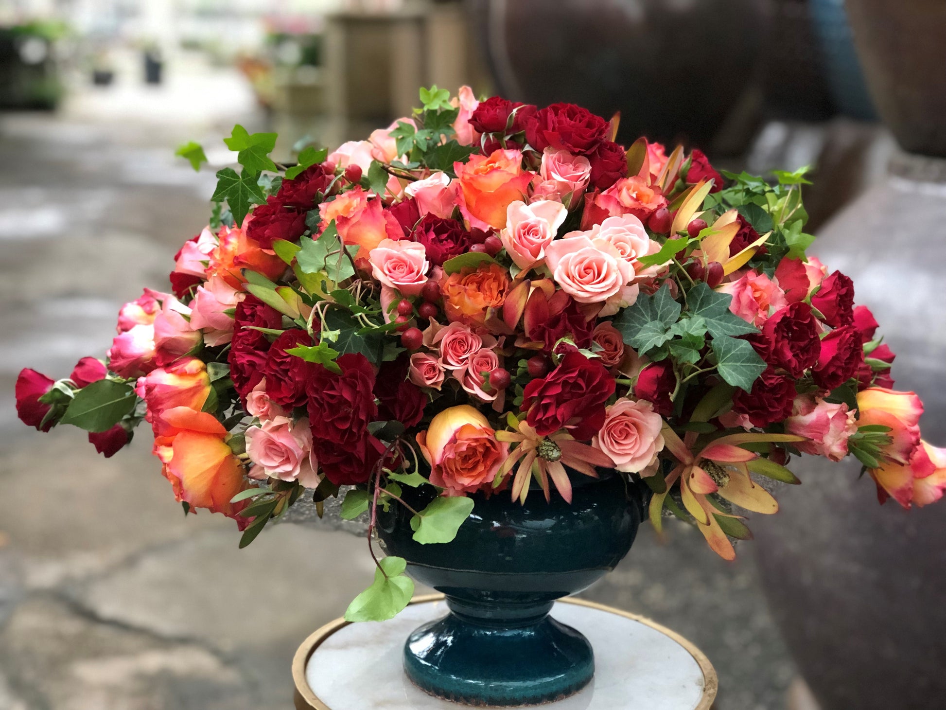 In a blue ceramic pot, a beautiful mix of roses, spray roses, safari sunset, berries and ivy