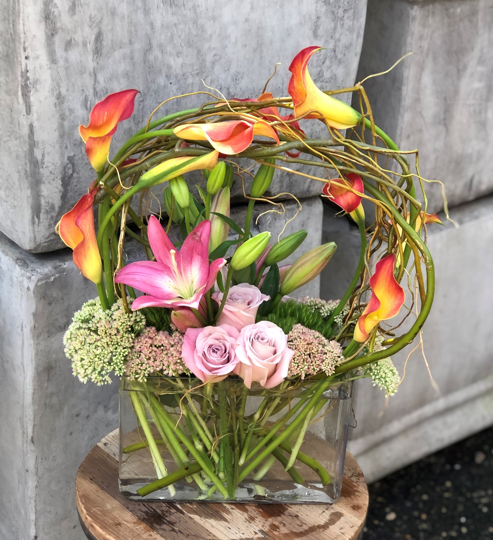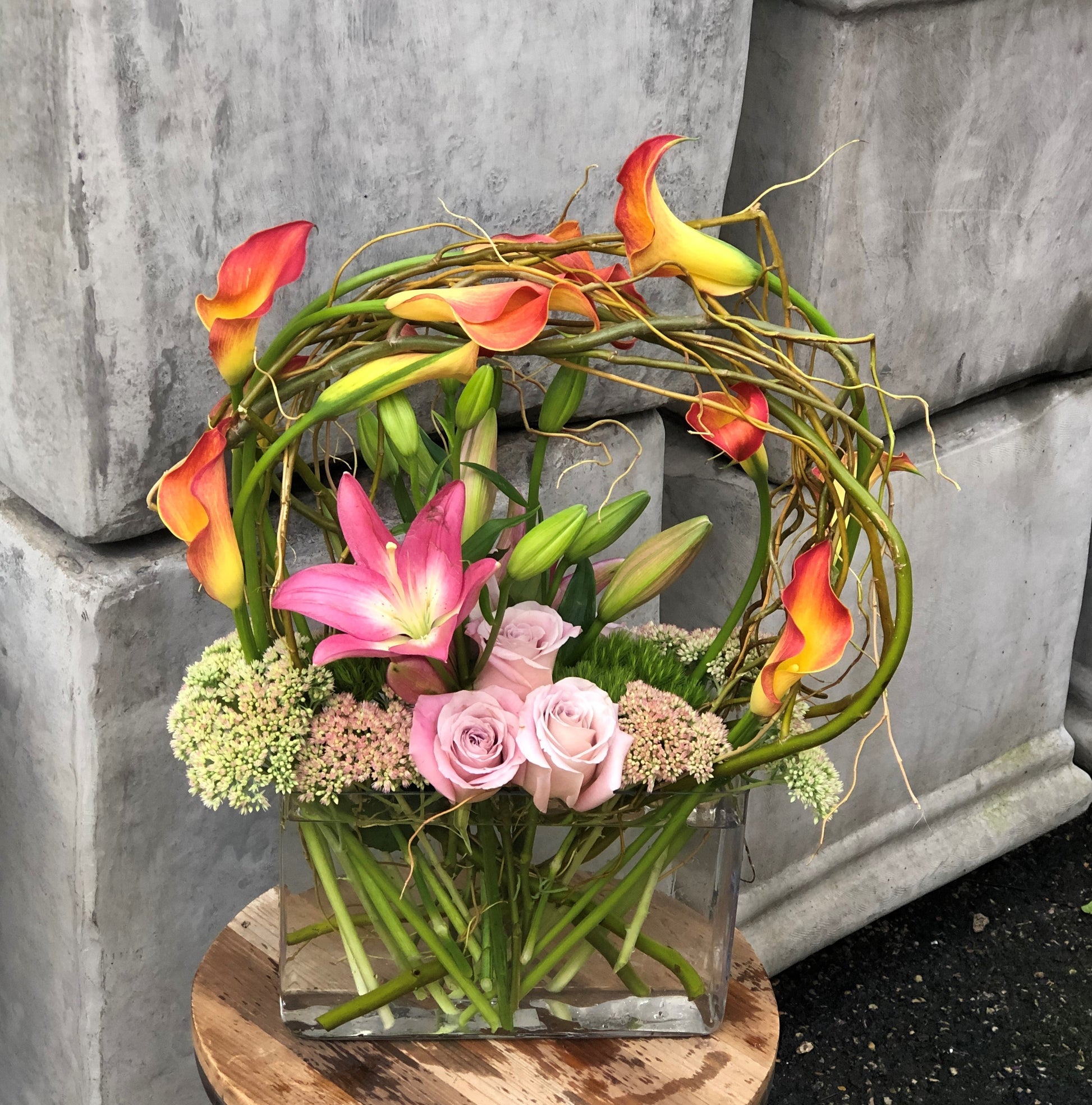 In a rectangular glass vase a bed of lavender roses, purple/ pink greenery, pink lilies and a designed look of curly willow and "Fire" calla lilies, perfect for any occasion. Same day delivery