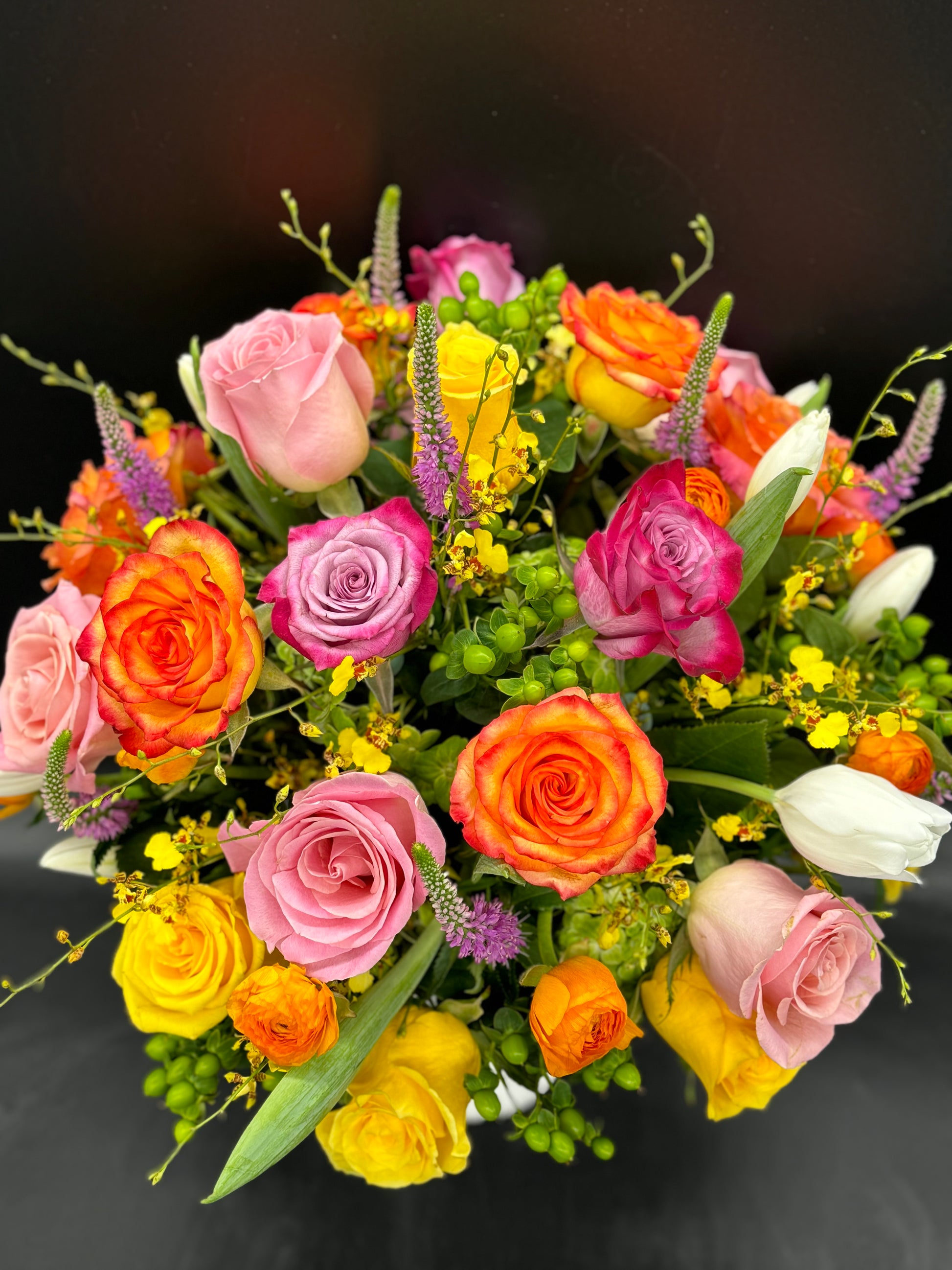 Roses, Tulips, Ranunculus, Oncidium Orchids, Veronica, Green Berries, Hydrangeas