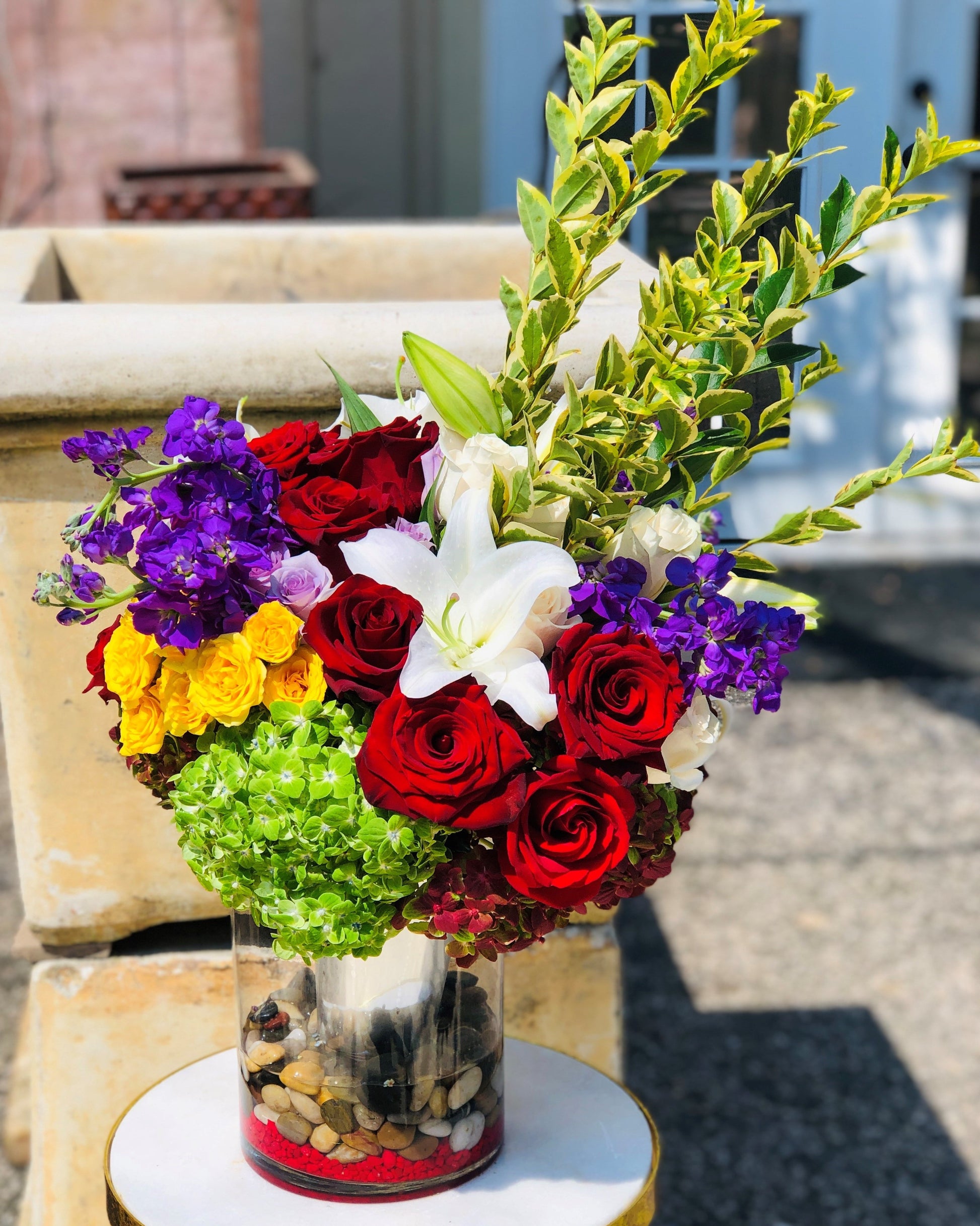 In a medium cylinder vase with river rocks, green and red antique hydrangea, red and white roses, yellow spray roses, White casablanca lilies, purple stock and greenery. A very designed look for same day delivery.