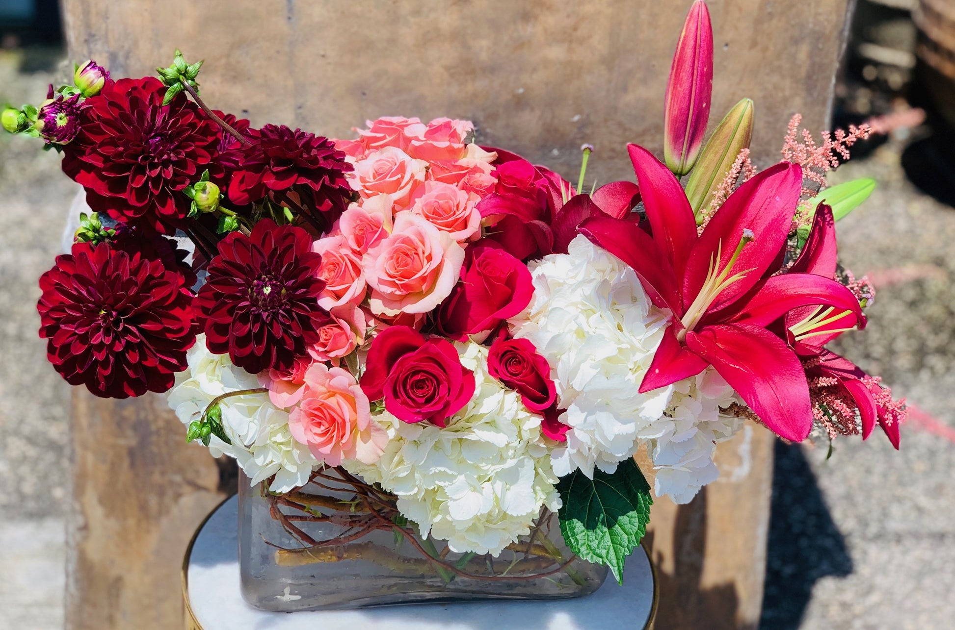 This exquisite unique arrangement consist of White hydrangea, red and pink roses, red lilies, and burgundy dahlias for a romantic feel