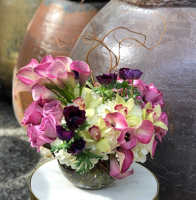 In a glass bowl a mix of white hydrangea, lavender roses and calla lilies, and purple tulips.