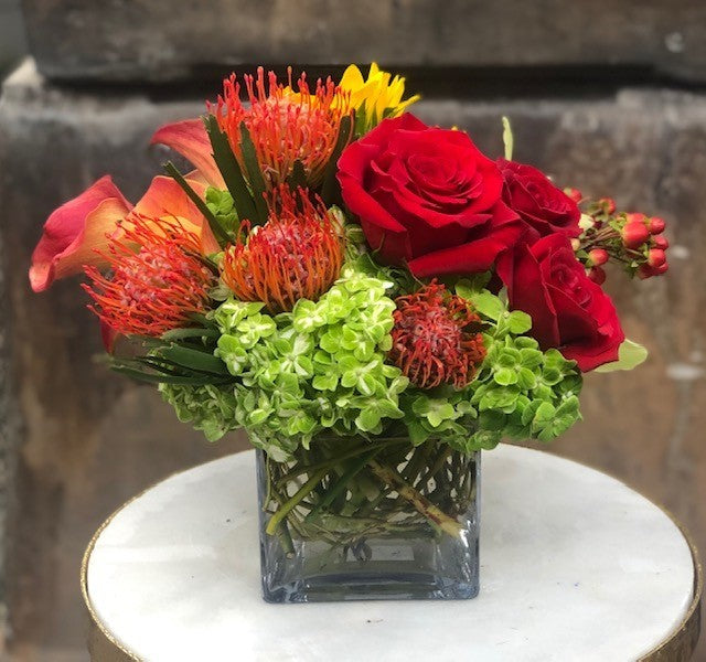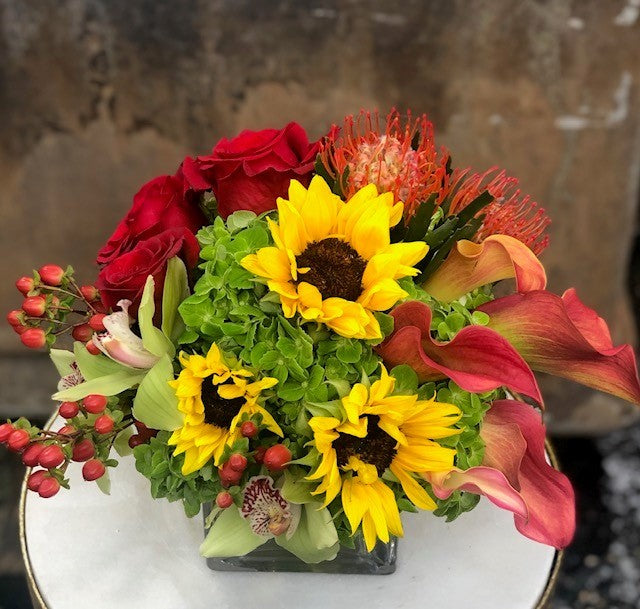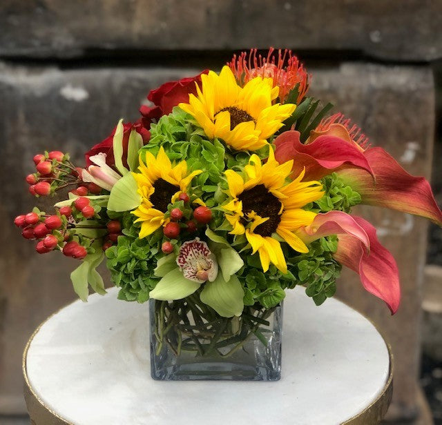 In a low square glass vase with a mix of green hydrangea, red roses, yellow sunflowers, red berries, pink calla lilies, orange pincushion protea and green cymbidium orchids. Same day delivery.