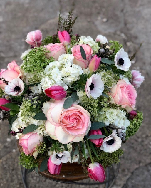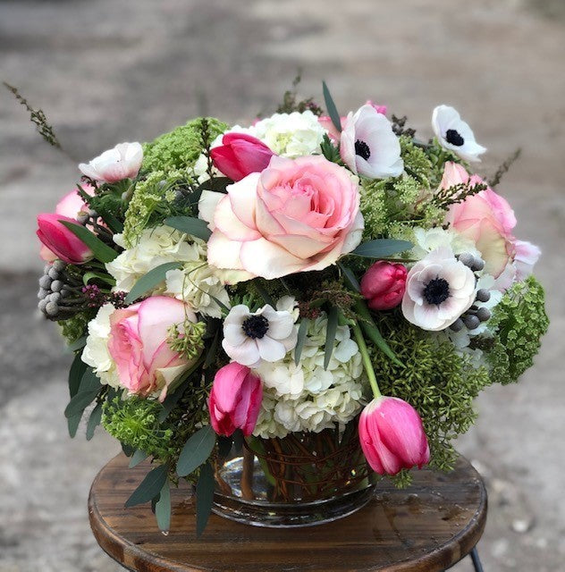 In a large glass bubble bowl a mix of white hydrangea, pink roses, pink tulips, anemones, brunia berries, queen annes lace and greens.
