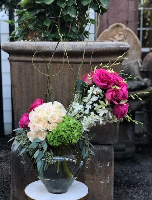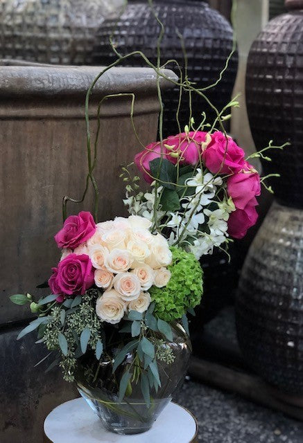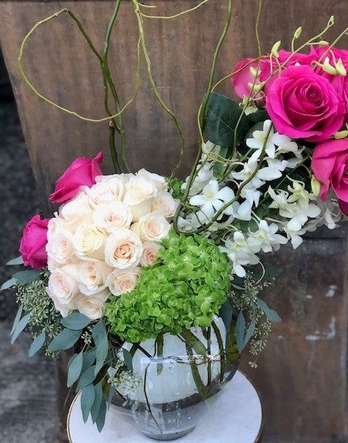 In a large glass vase a beautifully designed arrangement of green hydrangea, clusters of hot pink and white vendela roses, white dendrobium orchids and seeded eucalyptus. One of a kind arrangement. Please call to confirm same day delivery.