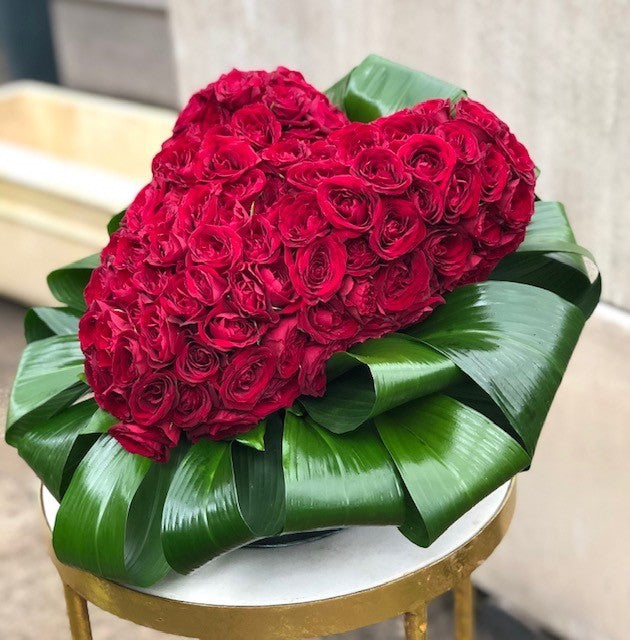 In a cylinder glass vase a bed of tea leave greenery and a heart shaped filled with roses.