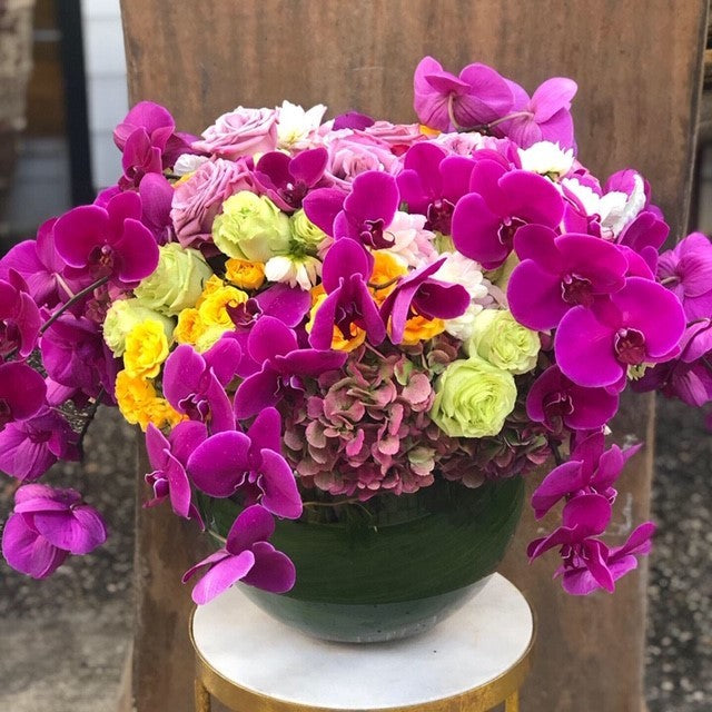A beautiful mix of Antique purple hydrangea, lime roses, yellow spray roses, lavender roses, White with purple orchids, and dusty miller in a large leaf wrapped bowl. * Same day delivery* * Seasonal flowers*