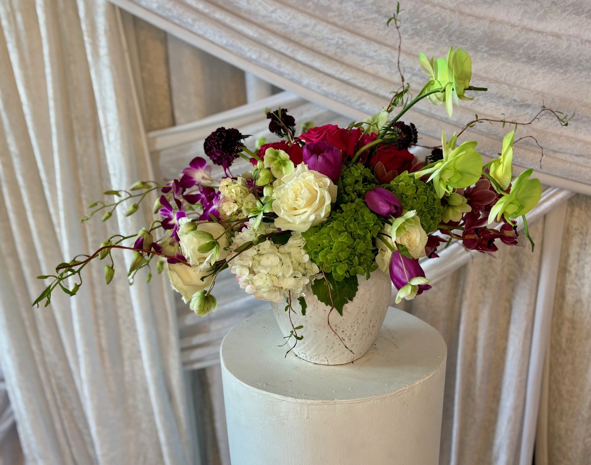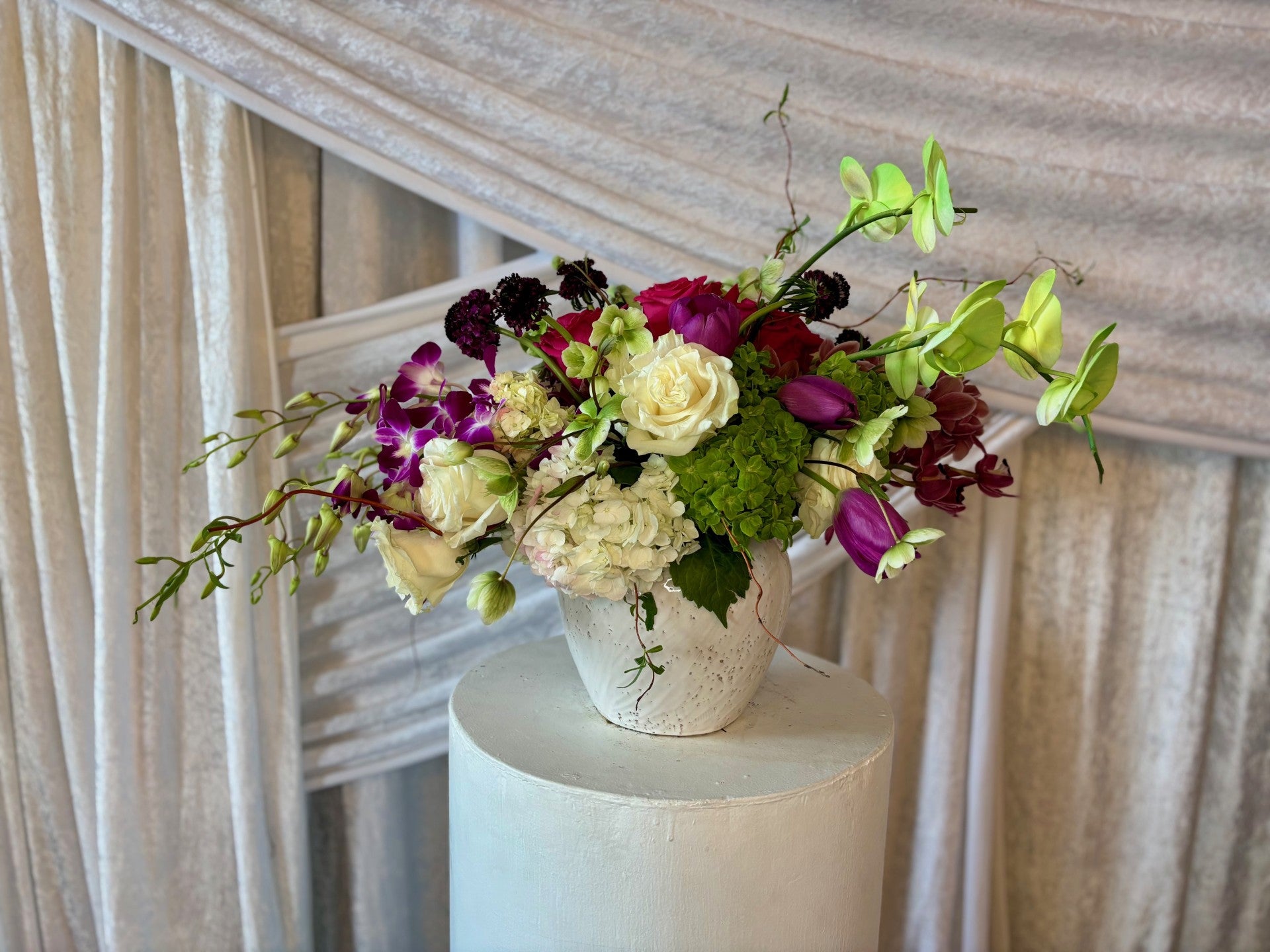 Roses, Tulips, Scabiosas, Spray Roses, Hellebore, Phalaenopsis Orchids, and Dendrobium Orchids, Hydrangeas