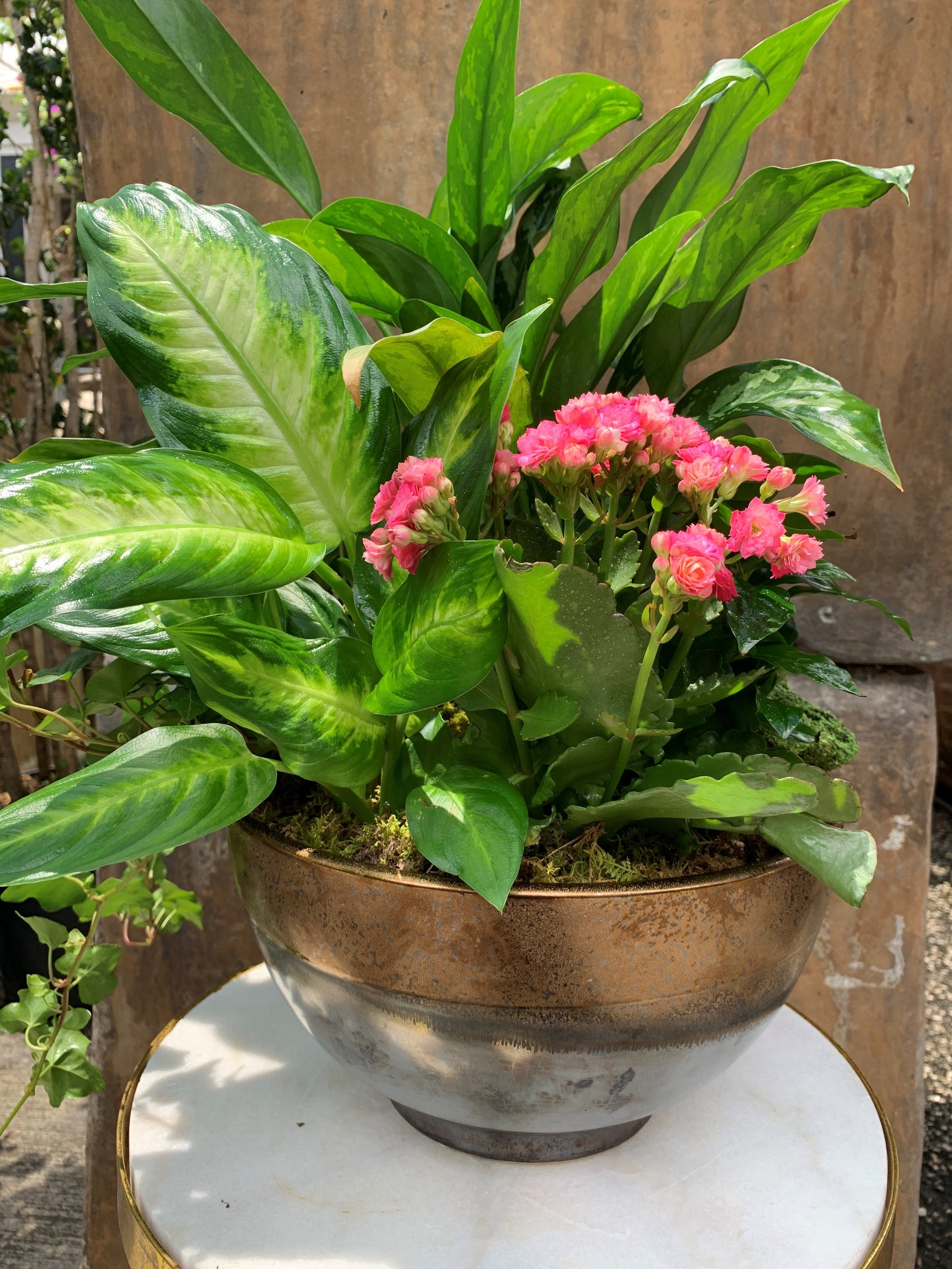 In a two toned gold and copper pot with a mix of a pink Kalanchoe, Green Ivy, and Verigated Chinese Evergreen dressed with moss.
