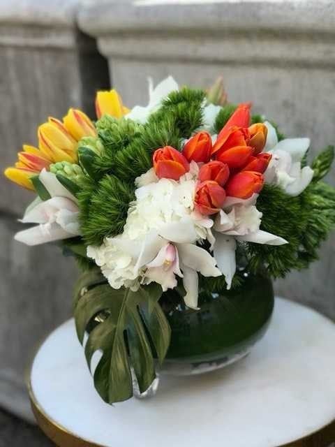 A collection of White Hydrangea, White Cymbidium Orchids, White Hyacinths, Orange and Yellow Tulips with touches of Green Trick complimented with Monstera-Leaves designed in an elegant glass bowl.