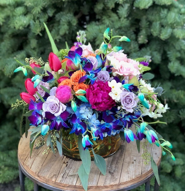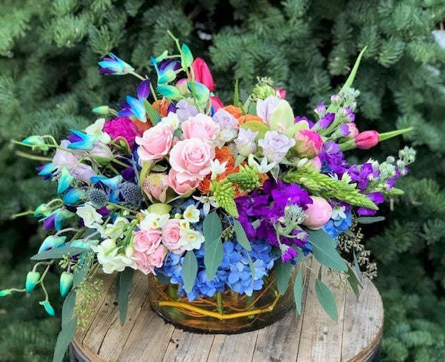 In a low cylinder glass vase a mix of blue hydrangea, pink and lavender roses, pink and burgundy roses, dark purples stock, blue dendrobium orchids, green cymbidium orchids, stars of bethlaham, orange roses and seeded eucalyptus.