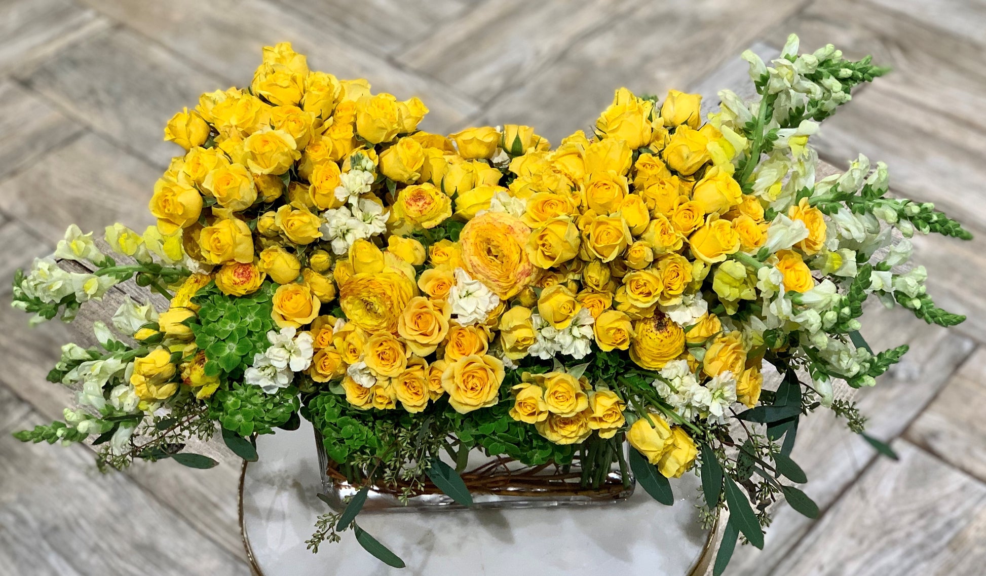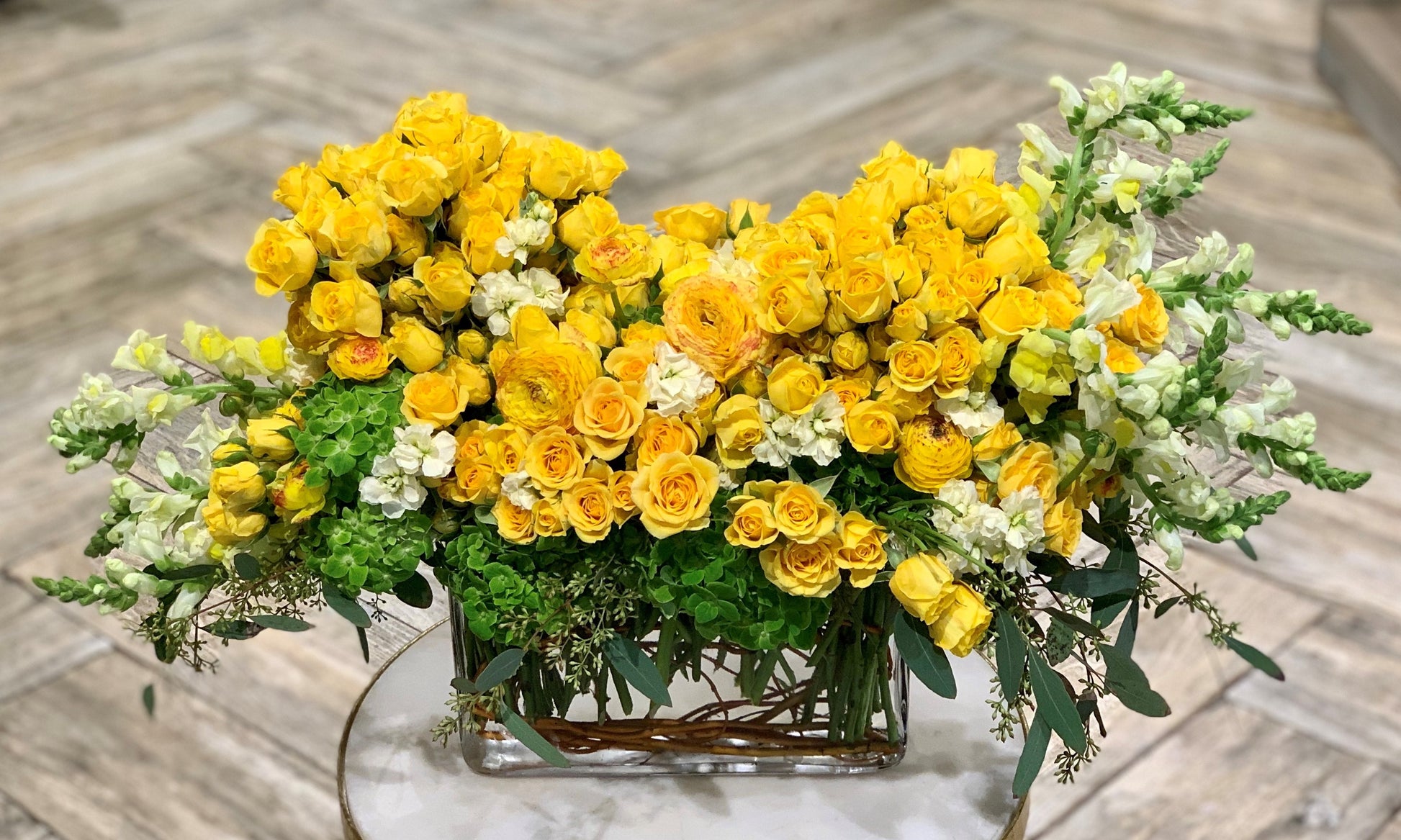 In a long and low vase a mix of green hydrangea, yellow spray roses, yellow ranunculus, yellow snapdragons, white stock and seeded eucalyptus.