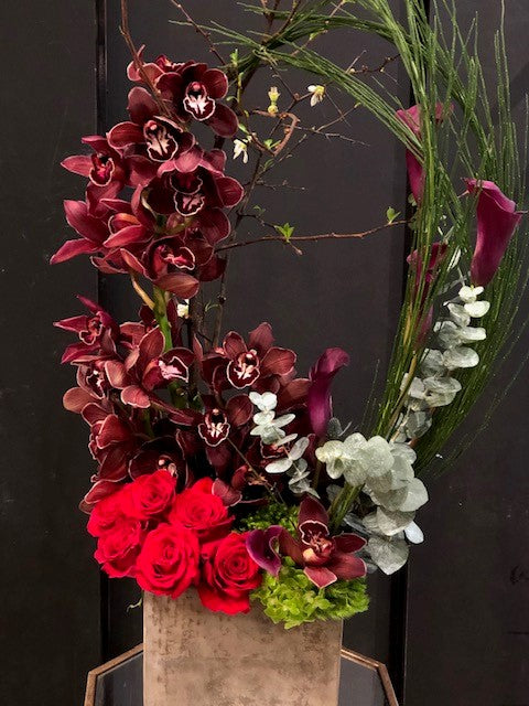Hydrangea, Roses, Cymbidium Orchids, Calla Lilies, Blooming Branches, and Eucalyptus dressed in a contemporary ceramic pot. This arrangement says: "You are my Queen!"