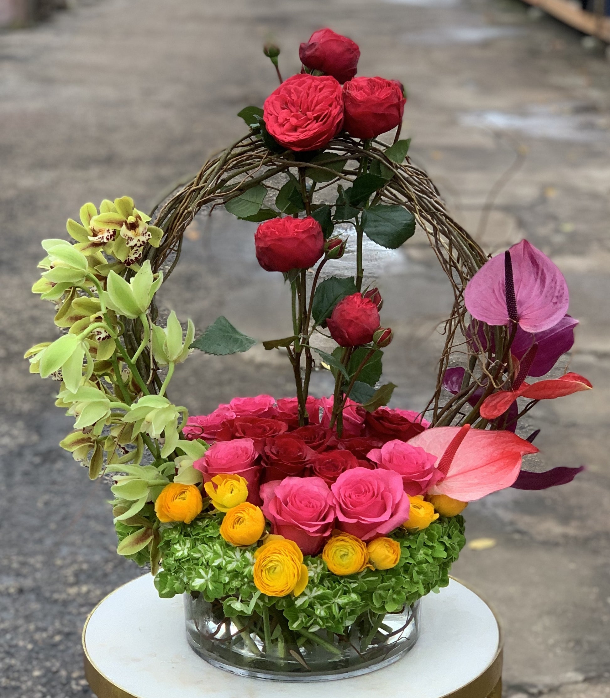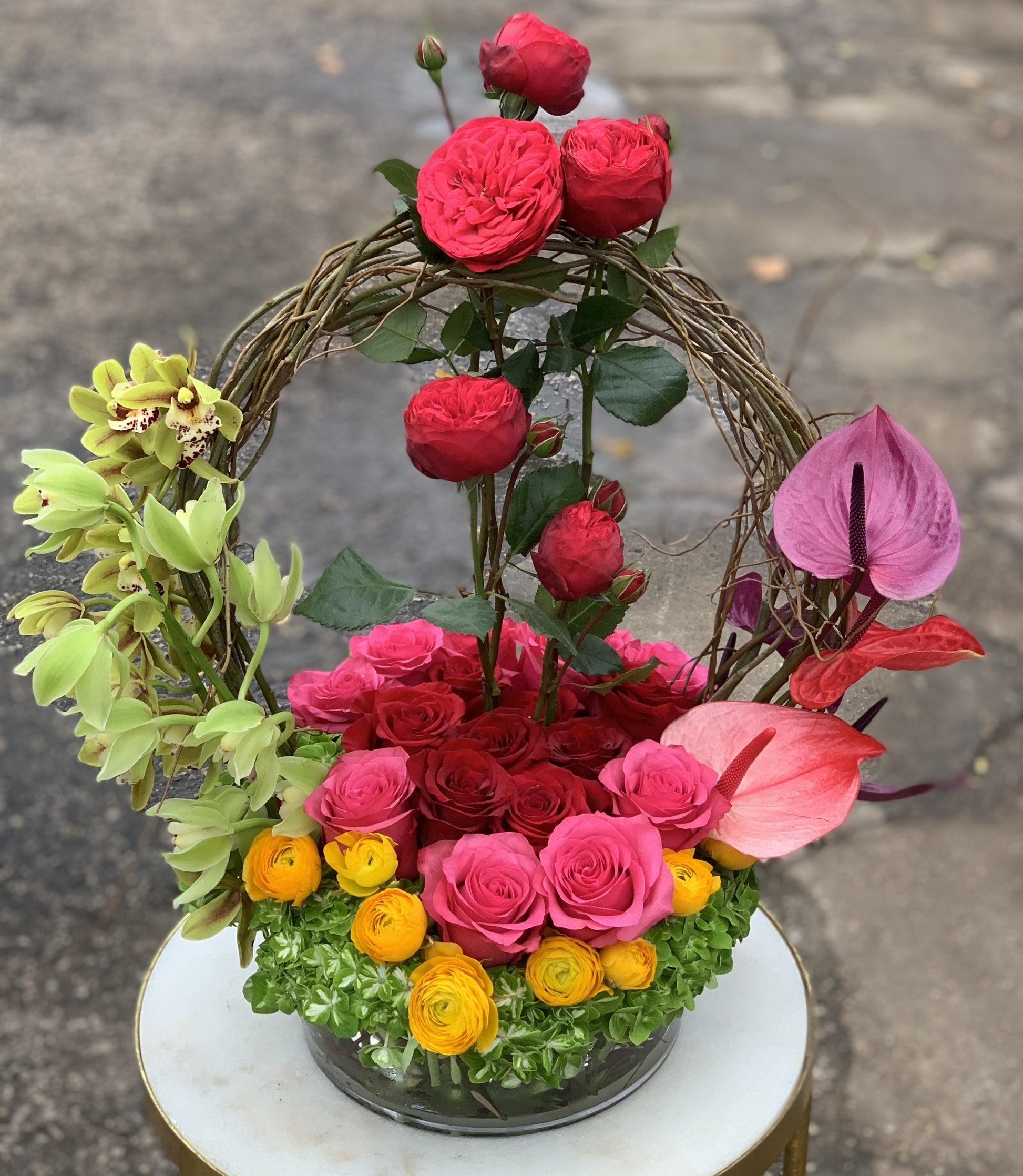 In a low cylinder, green hydrangea, yellow ranunculus, pink and red roses, Avery unique look with curly willow, green cymbidium orchids, red garden roses and anthirium.