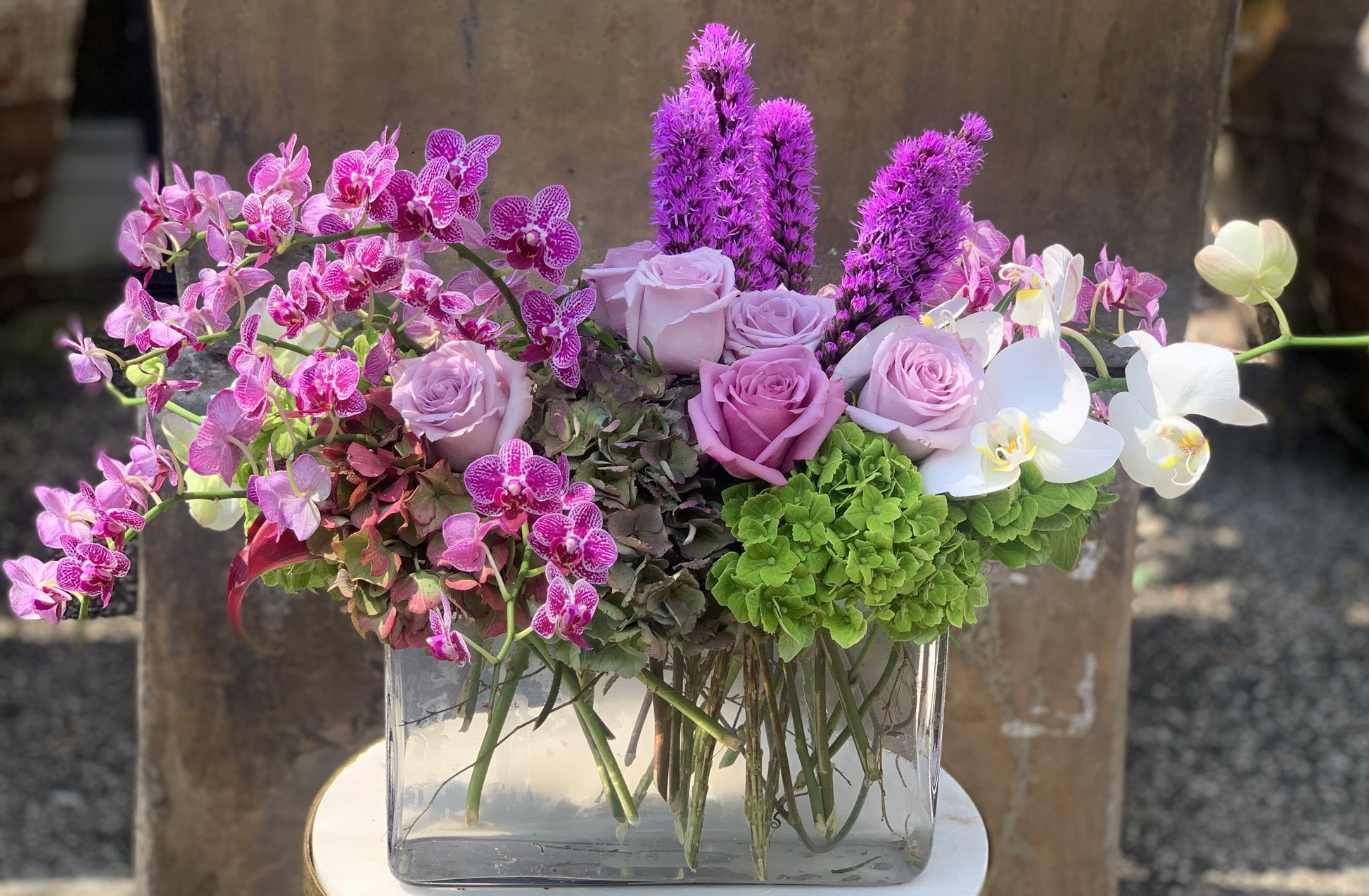 In an envelope vase a mix of antique hydrangea, green hydrangea, lavender roses, purple liatris, white phalo orchids, and purple orchids. Beautiful centerpiece available for same day delivery.