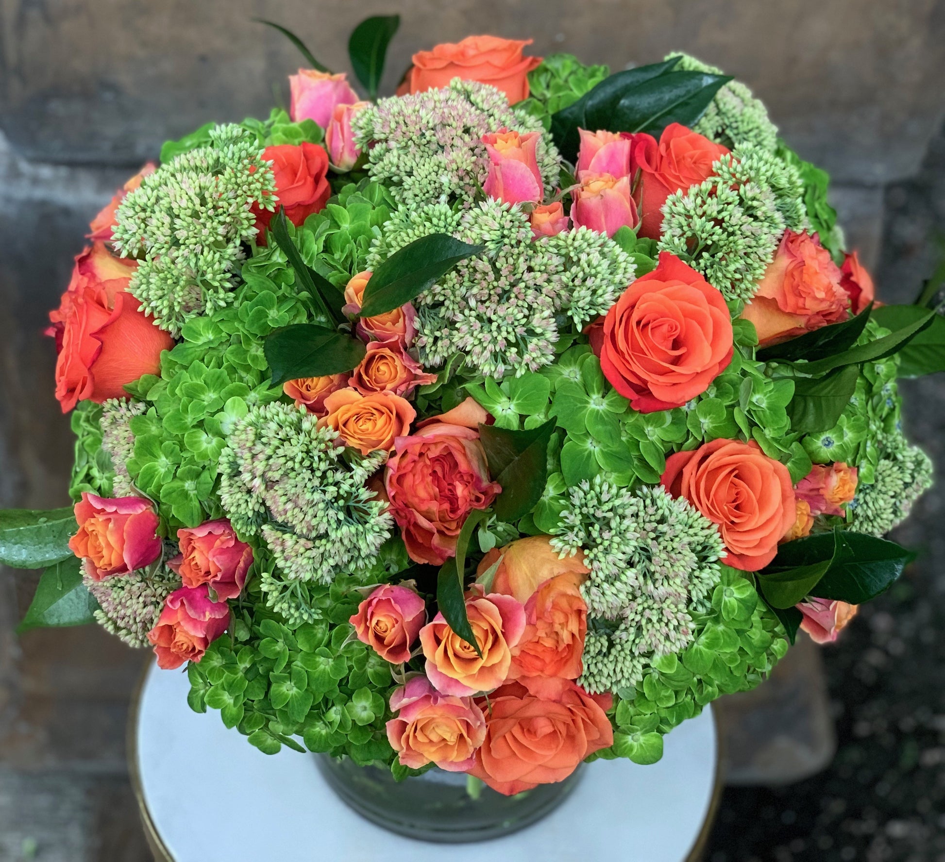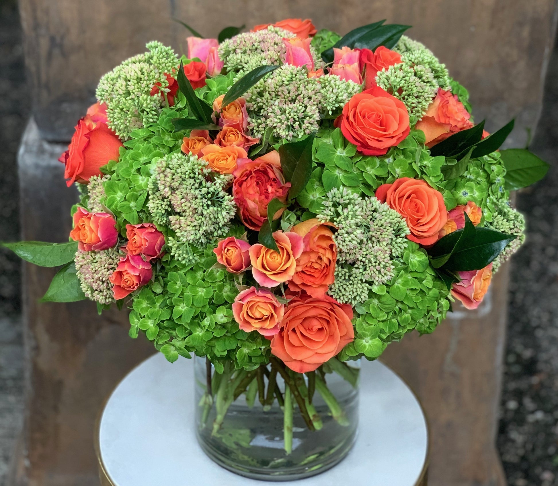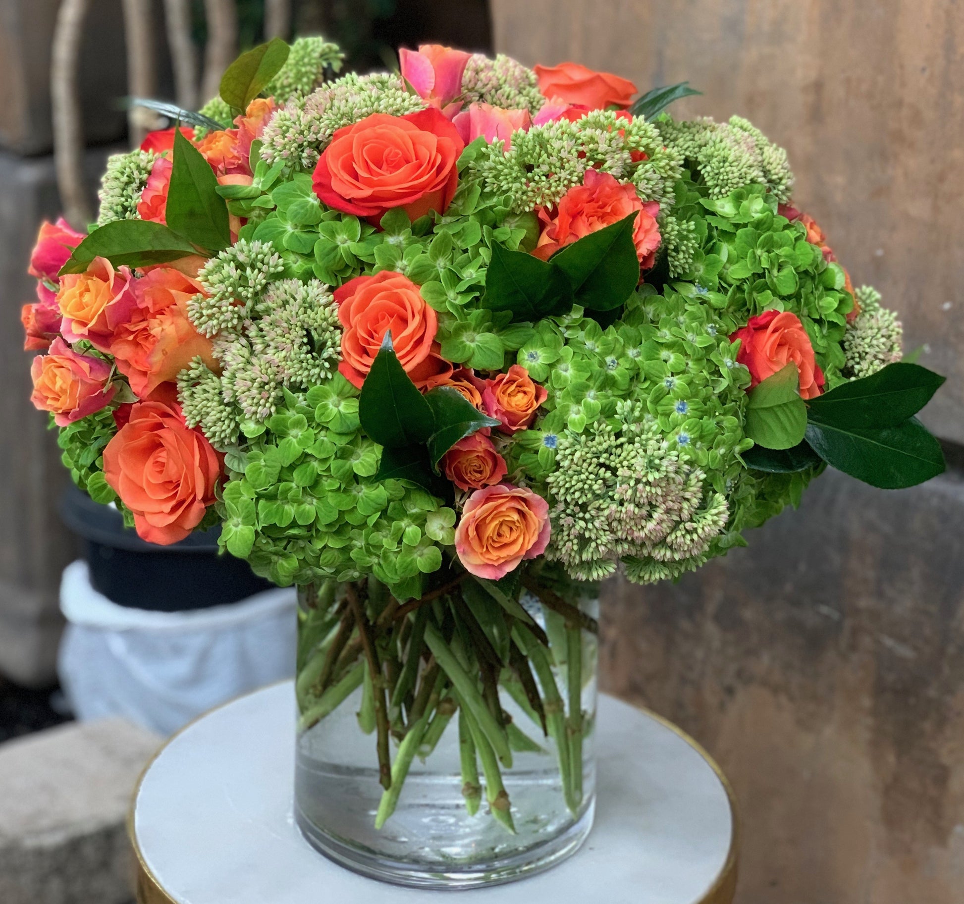 In a medium cylinder glass vase a mix of green hydrangea, orange roses, orange spray roses and filler. *Same Day Delivery*
