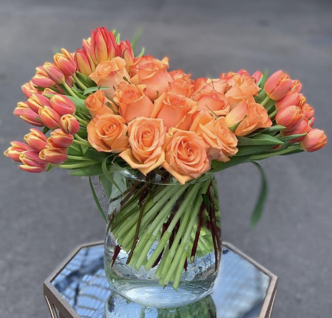 Beautiful Orange Roses and Orange Tulips In A Clear Vase