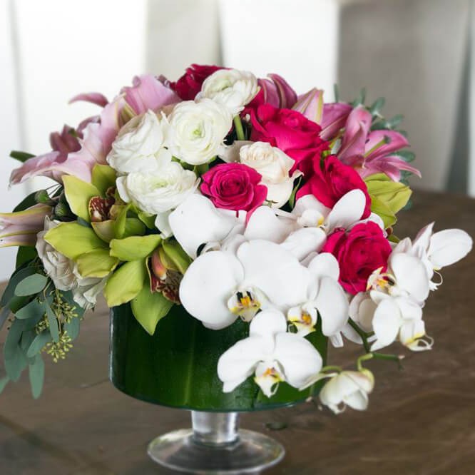 In a cylinder vase lined with leaf, mixes of white orchids, green cymbidium orchids, hot pink roses, white roses, ranunculus, stargaze lilies, and seeded eucalyptus