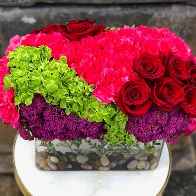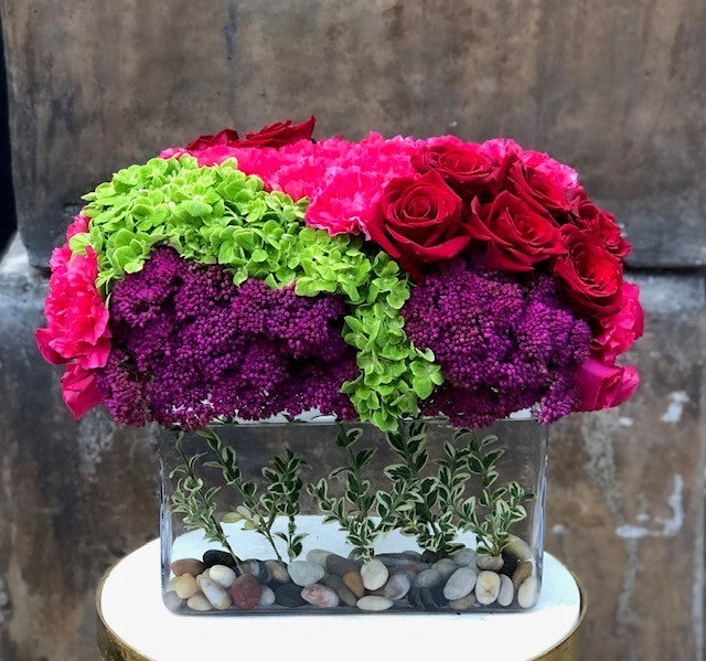In an envelope glass vase with river rocks and greenery, on top a beautiful mix of green hydrangea, pink carnations, red roses and purple sedum. Same day delivery.