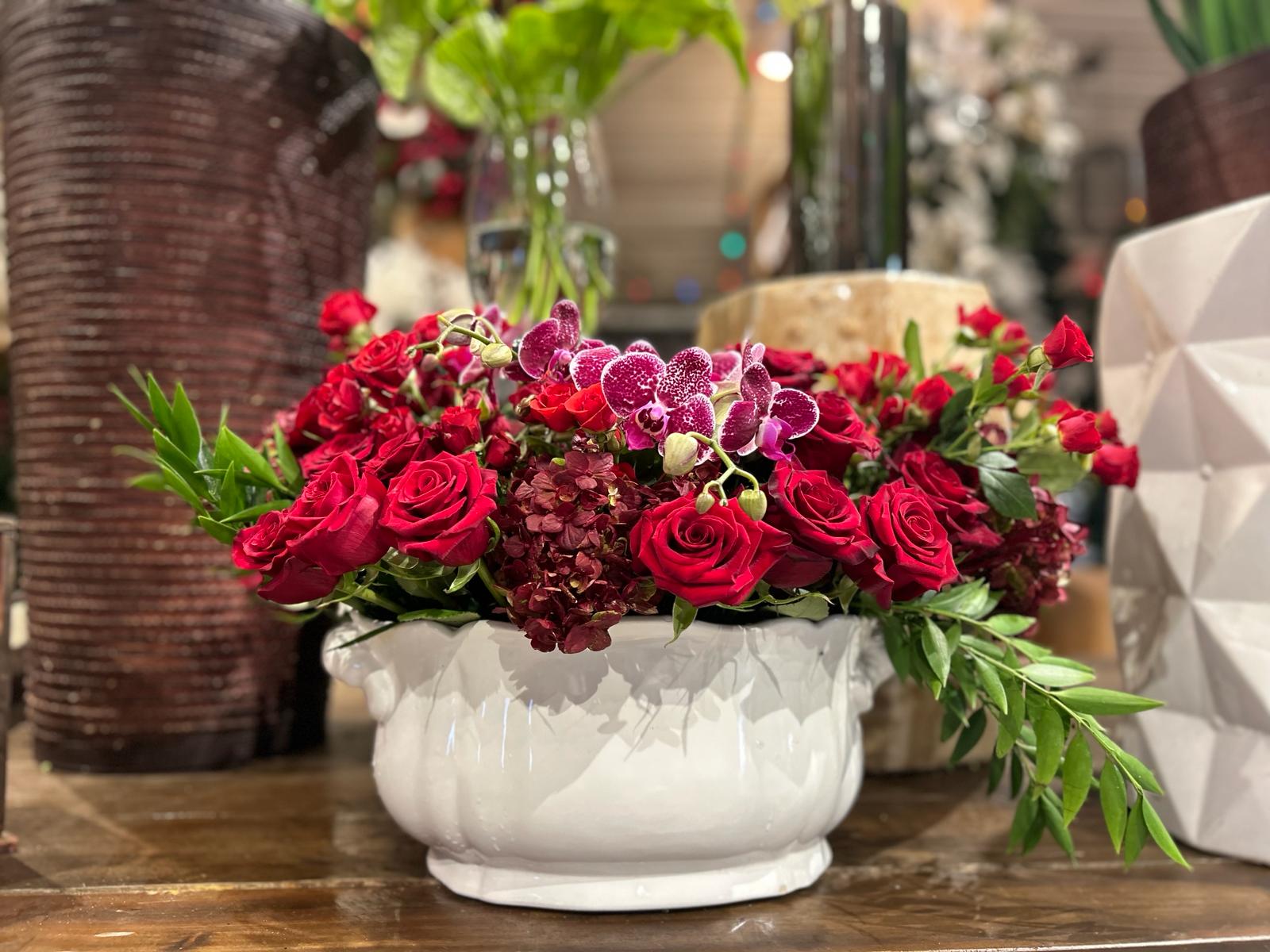 Gorgeous red arrangement with roses, orchids, spray roses, and burgundy hydrangea.