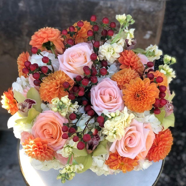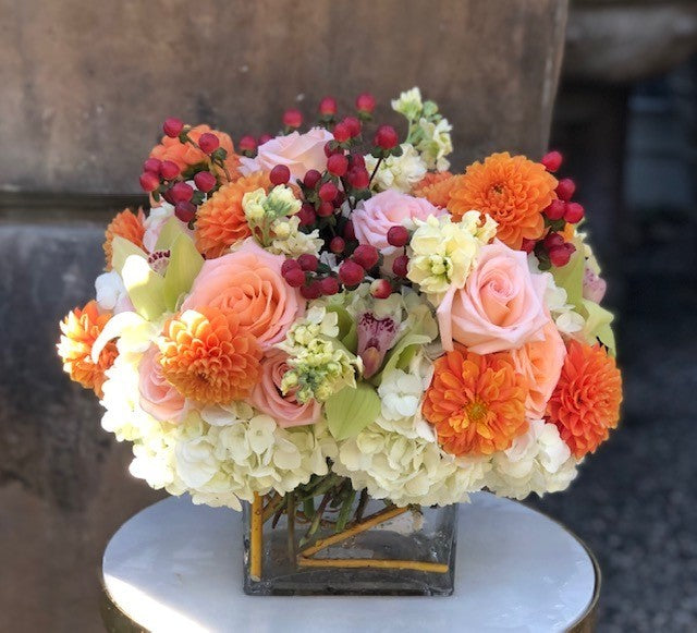 In a glass square vase a mix of white hydrangea, Pink roses, orange dahlias, red hypericum berries, cream stock and green cymbidium orchids.