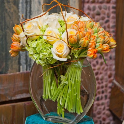 Lush Beautiful Cream Premium Roses & Parrot Orange Tulips. Design in Clusters for an Elegant but Cheerful Arrangement