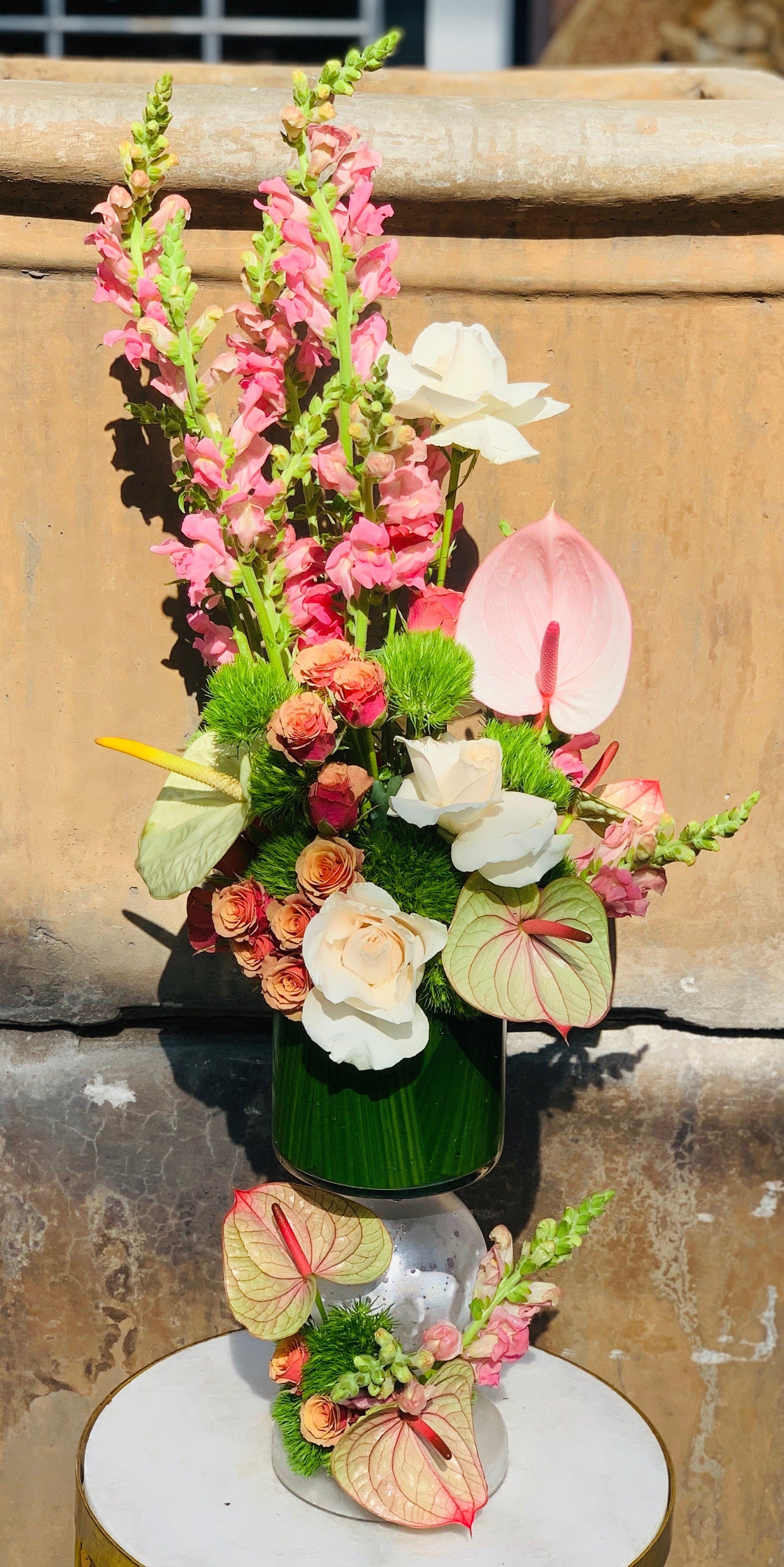 In one of our unique glass vases a designed look of pink roses, pink anthirium, green trick, ivory roses, green trick and pink snapdragons. *Same day delivery*