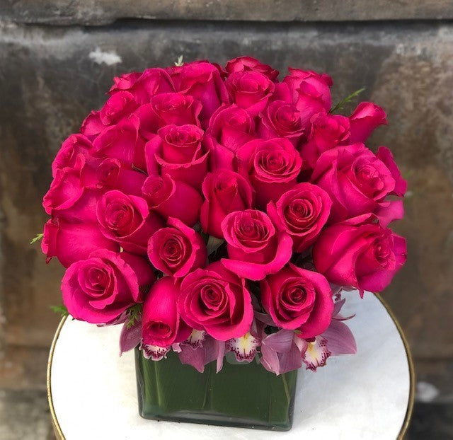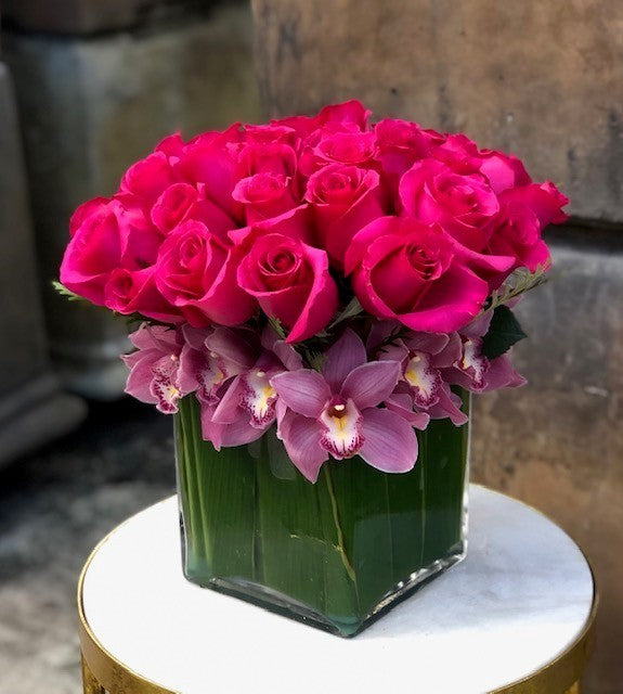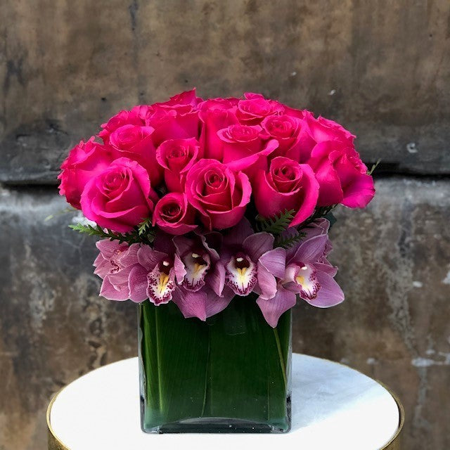 In a low leaf wrapped square vase with a bed of purple cymbidium orchids and a cluster of hot pink roses. A very clean and modern look for same day delivery.