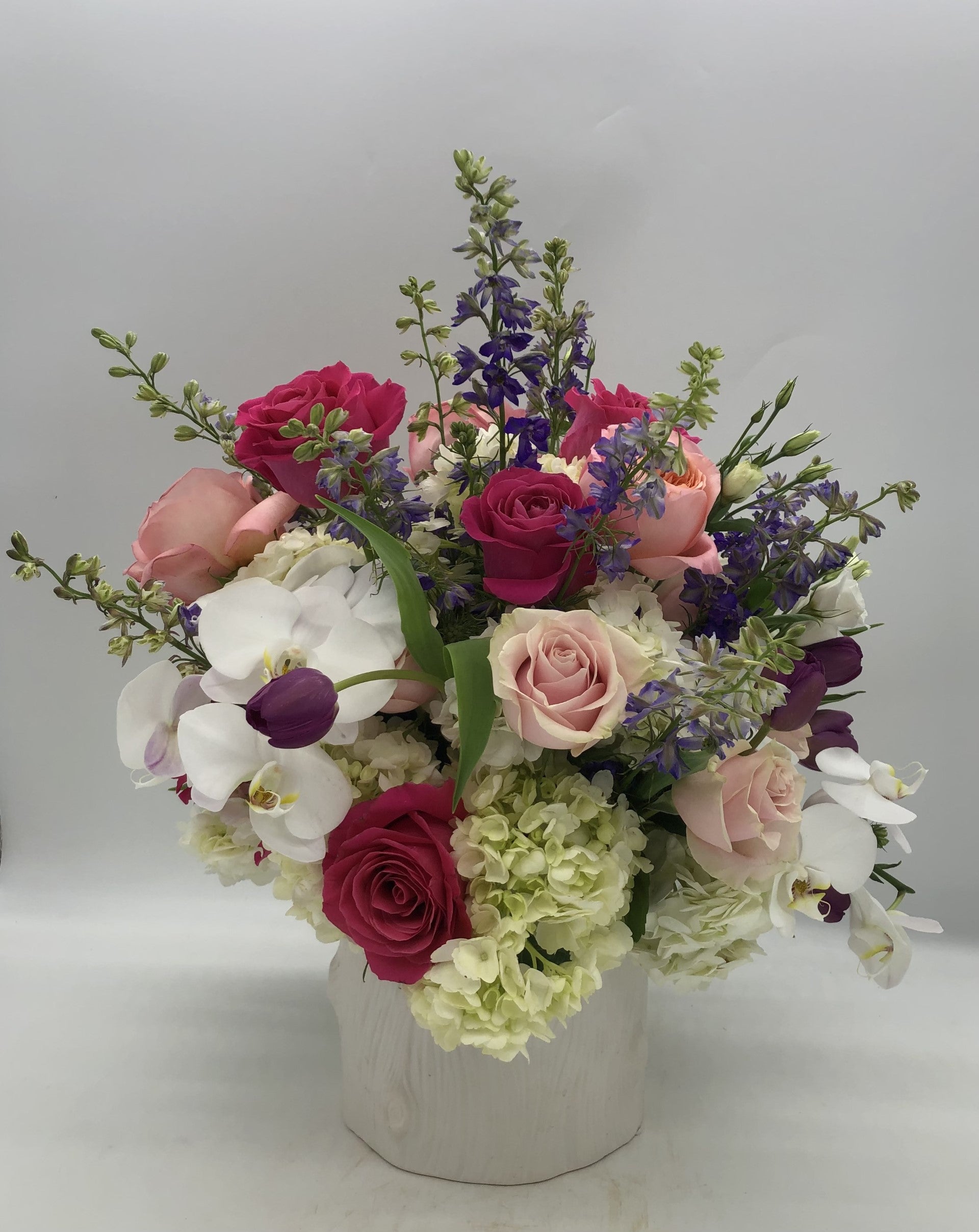 White Hydrangea, Purple Larkspur, Hot Pink & Soft Pink Roses, Soft Pink Garden Roses, Purple Tulips & White Phalo Orchids In A Beautiful White Ceramic Trunk Vase.