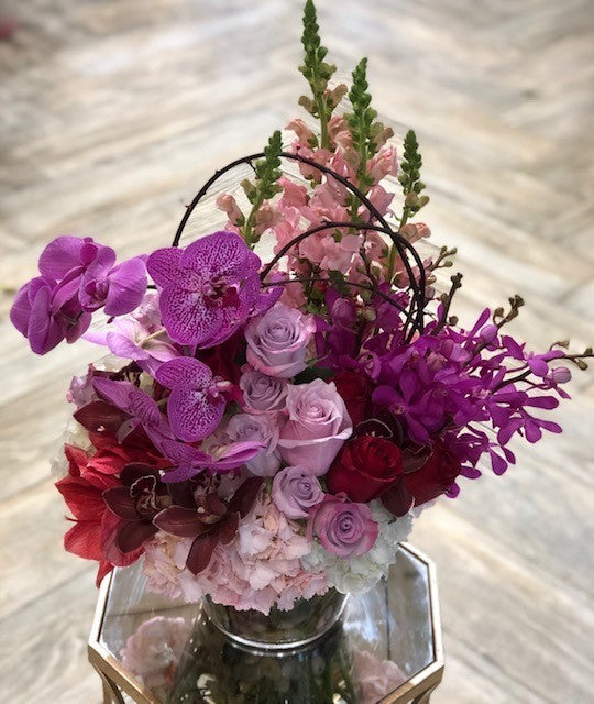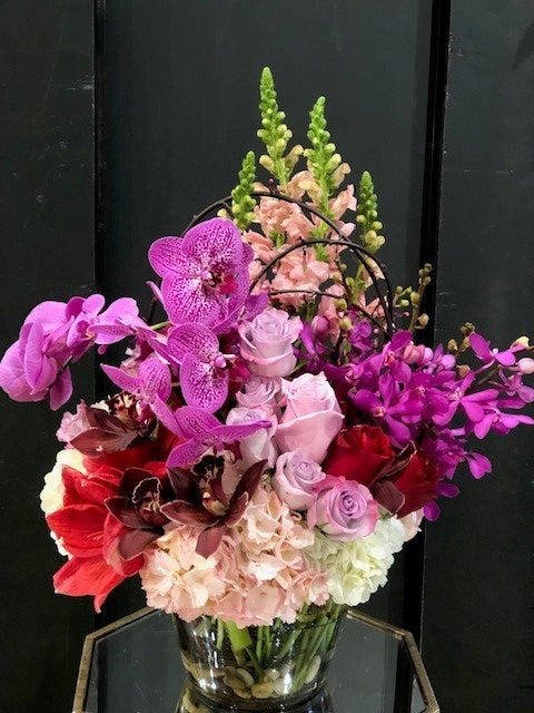 A Purple themed mix of Hydrangea, Roses, Amaryllis, Snapdragon, Dendrobium Orchids, and Phaleonopsis orchids dressed in a low glass vase. H:20" W:8"