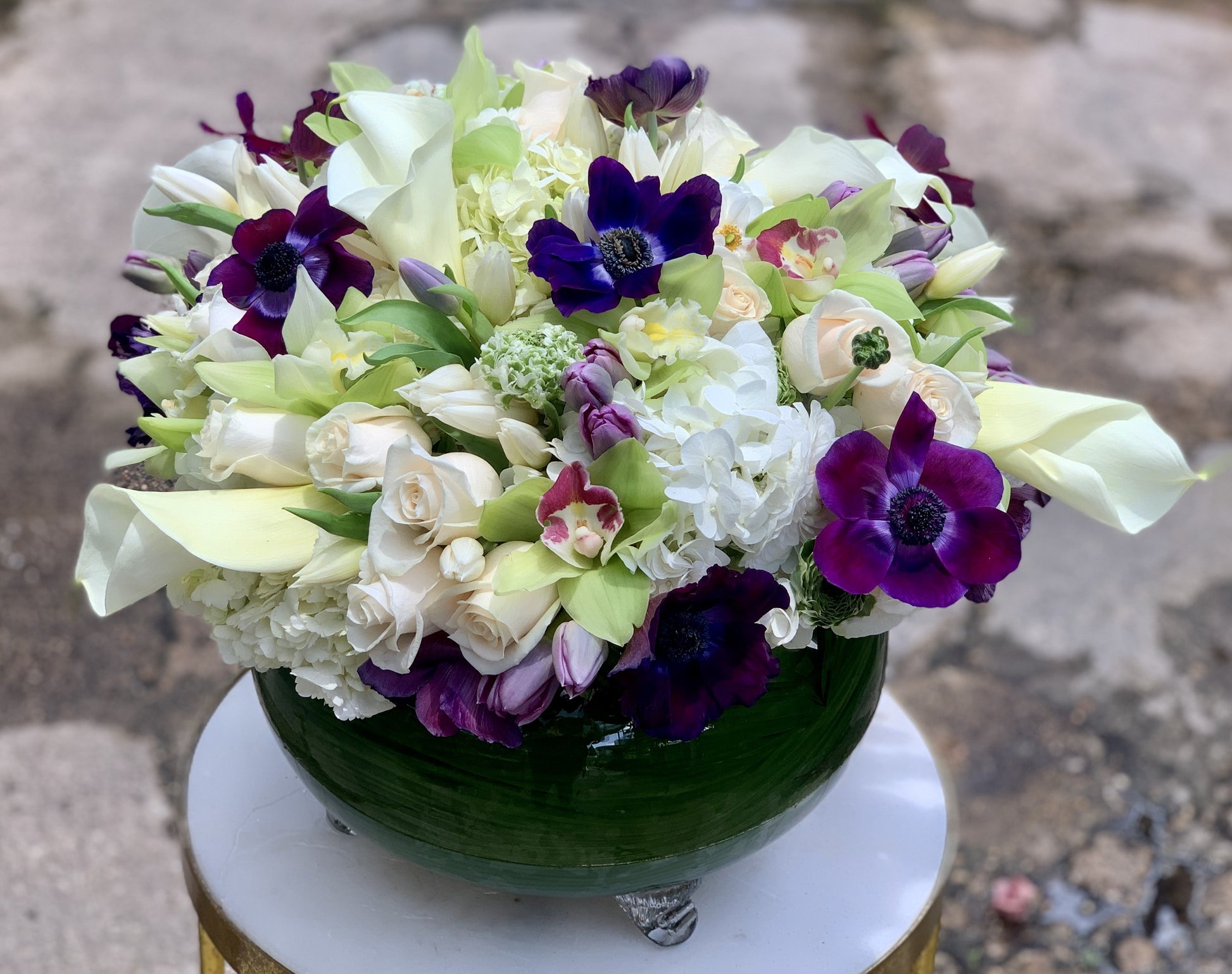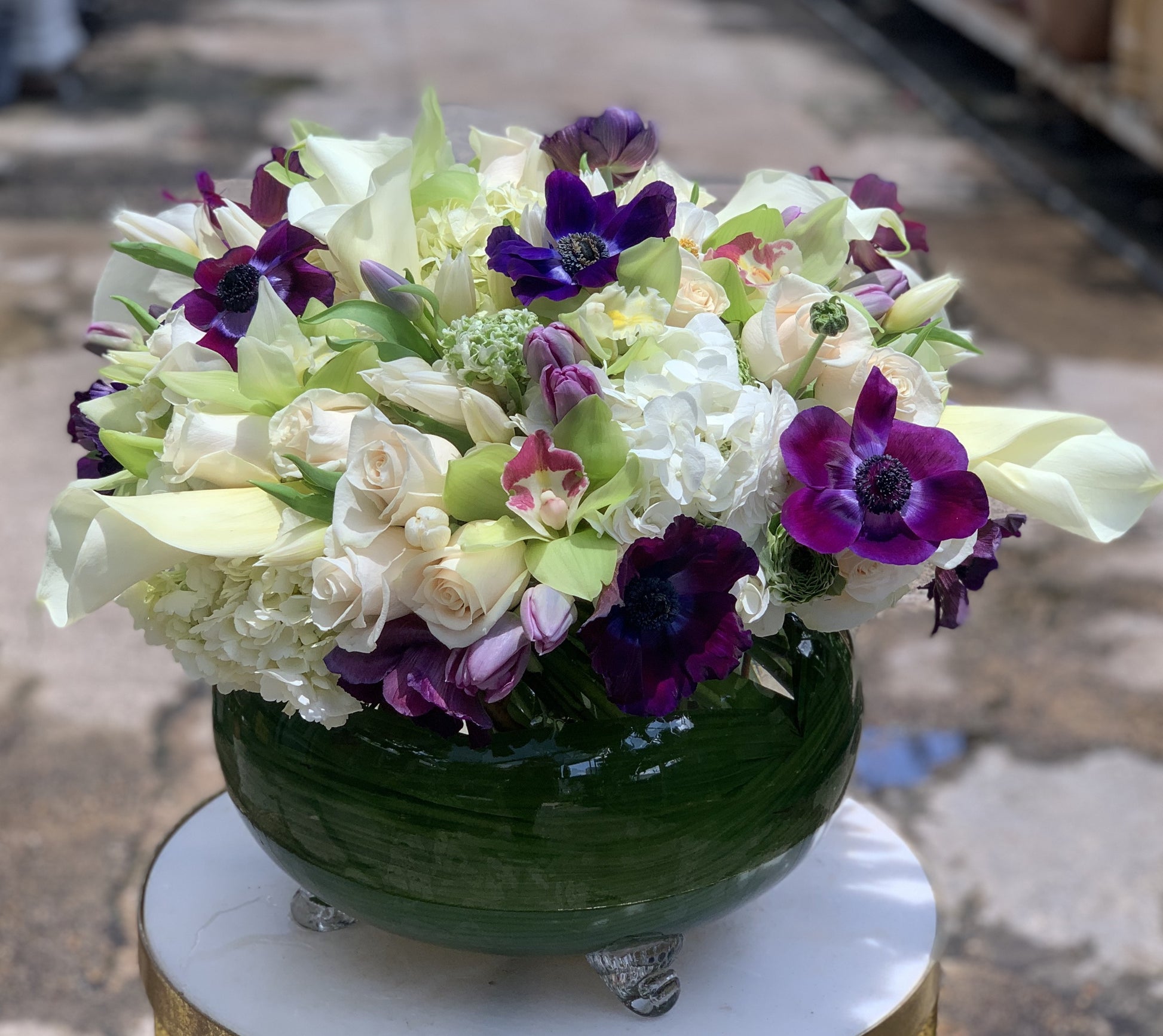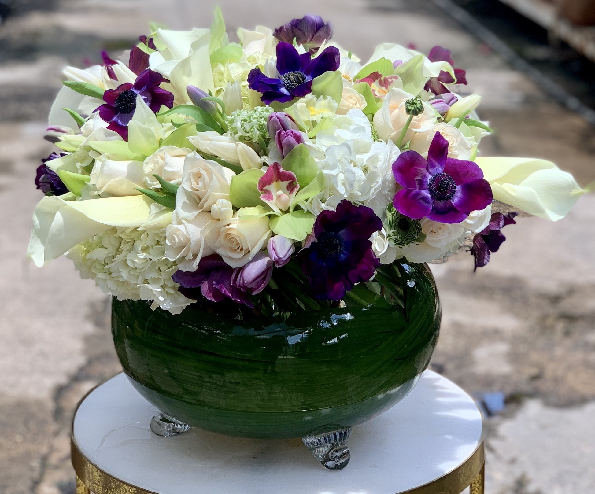 Gorgeous anemones, hydrangea, and cymbidium orchids make this a stunning flower piece