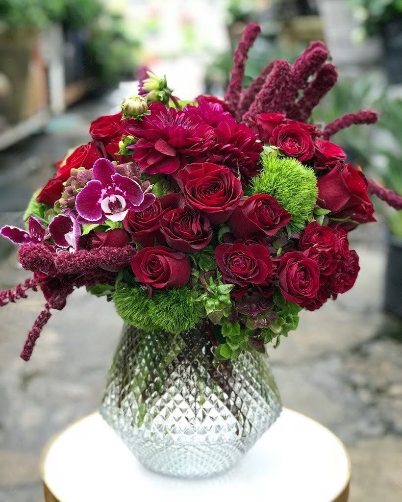 Red roses, red spray roses, green trick, green hydrangea, fuchsia phalos orchids, raspberry dahlias