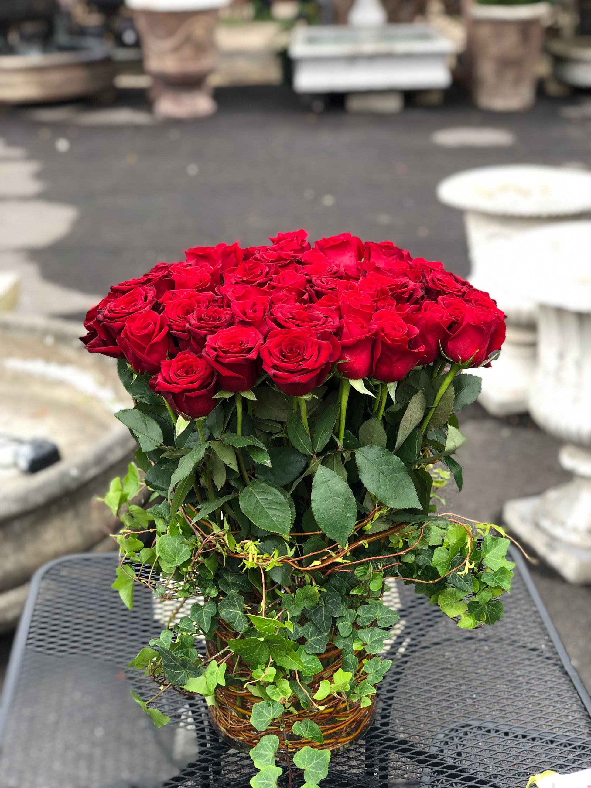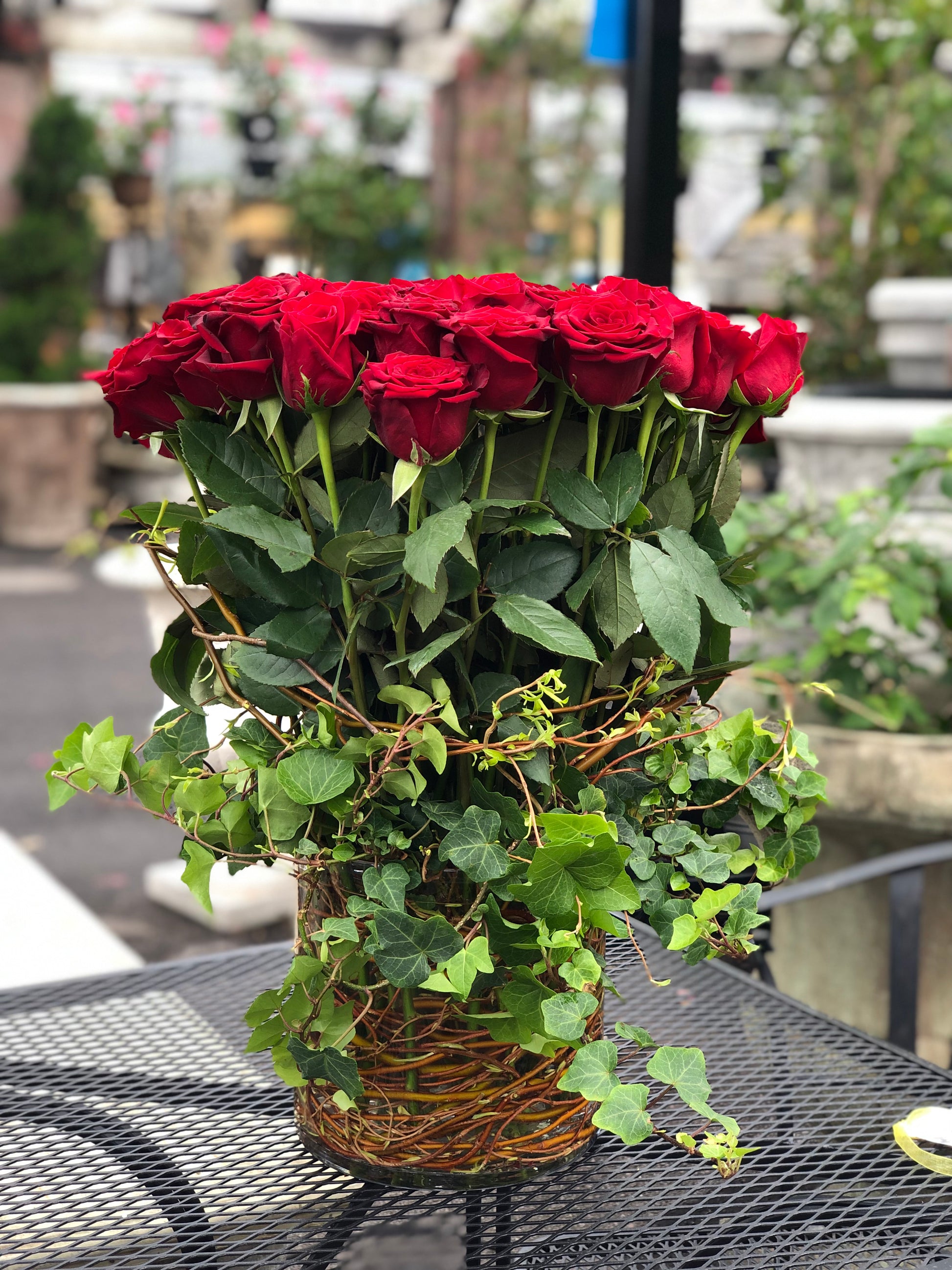 Red roses with ivy wrapped around them and curly willow wrapped around clear vase